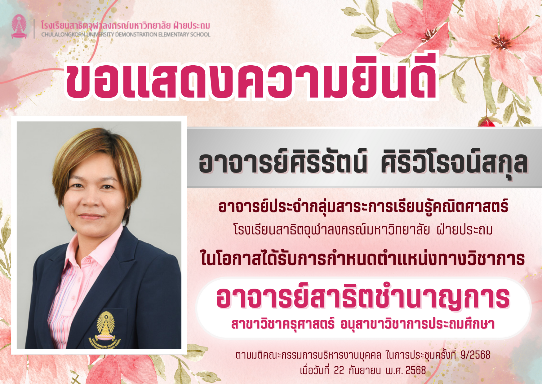 ขอแสดงความยินดีแด่ อาจารย์ศิริรัตน์ ศิริวิโรจน์สกุล ในโอกาสได้รับการกำหนดตำแหน่งทางวิชาการ “อาจารย์สาธิตชำนาญการ” สาขาวิชาครุศาสตร์ อนุสาขาวิชาการประถมศึกษาWeb Master2025-10-01T08:51:01+07:00October 1, 2025|