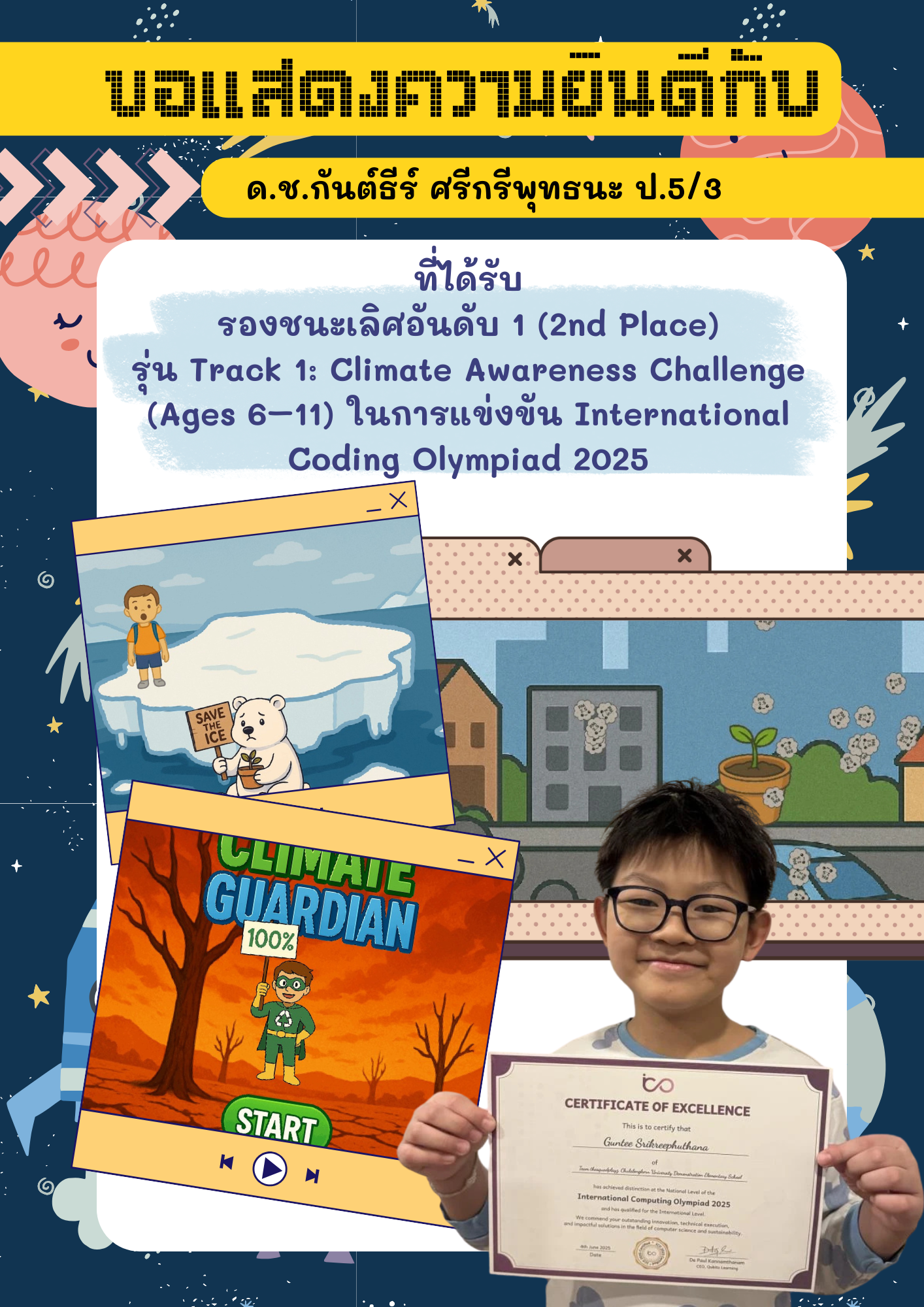 ขอแสดงความยินดีกับนักเรียนที่สร้างชื่อเสียงให้ประเทศไทยด้วยการคว้ารางวัล “รองชนะเลิศอันดับ 1 (2nd Place)” รุ่น Track 1: Climate Awareness Challenge (Ages 6–11) ในการแข่งขัน International Coding Olympiad 2025 ซึ่งเป็นการแข่งขันเขียนโปรแกรมระดับนานาชาติด้านการเขียนโค้ดและนวัตกรรมดิจิทัลWeb Master2025-10-01T14:31:59+07:00October 1, 2025|