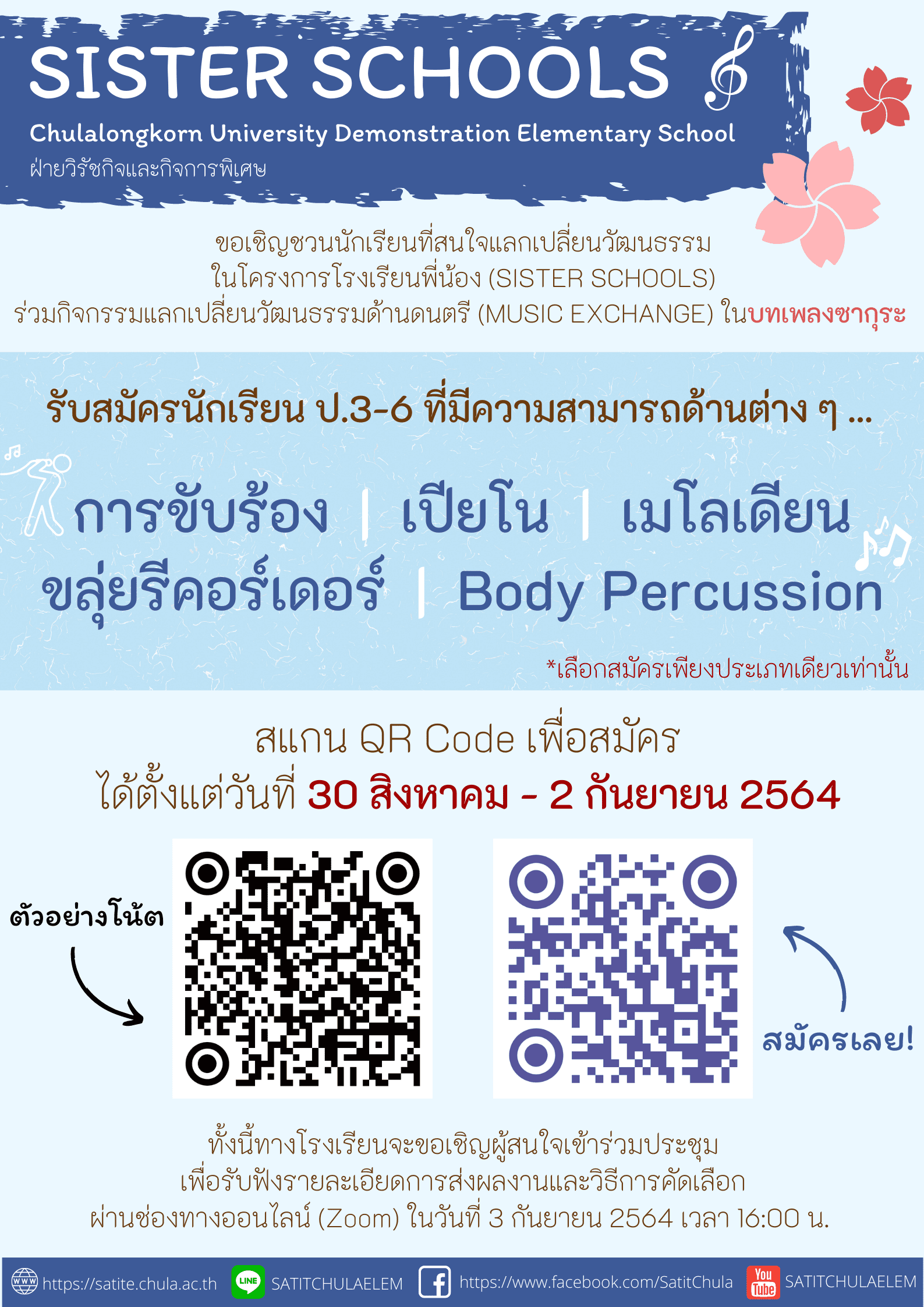 ฝ่ายวิรัชกิจและกิจการพิเศษ ขอเชิญชวนนักเรียนที่สนใจแลกเปลี่ยนวัฒนธรรมในโครงการโรงเรียนพี่น้อง Sister Schools ร่วมกิจกรรมแลกเปลี่ยนวัฒนธรรมด้านดนตรี (Music Exchange) ในบทเพลง ซากุระ