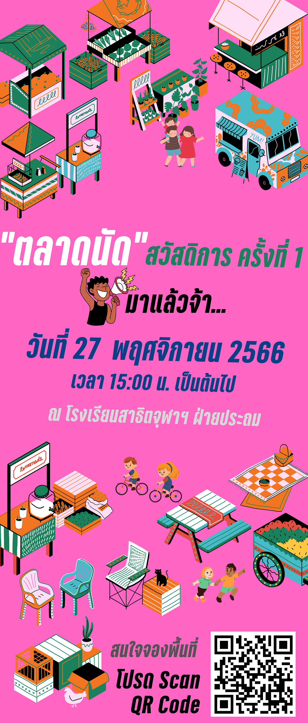 ขอเชิญชวนอาจารย์ เจ้าหน้าที่ นักเรียน ผู้ปกครอง นักเรียนเก่า และผู้ที่สนใจร่วมออกร้านจำหน่ายสินค้า หรือ ทำ workshop ใน “ตลาดนัดสวัสดิการ สาธิตจุฬาฯ ครั้งที่ 1” วันจันทร์ที่ 27 พฤศจิกายน 2566
