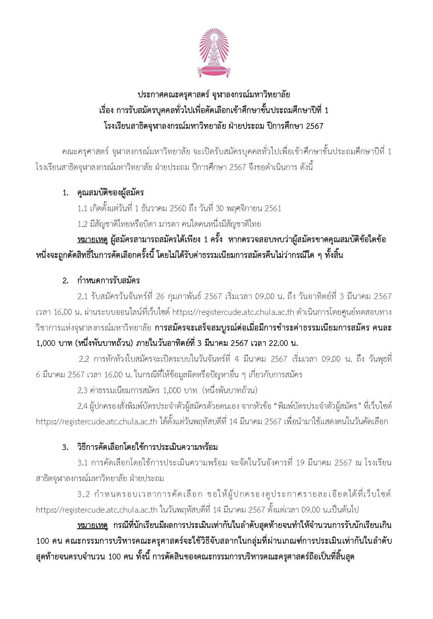 คณะครุศาสตร์ จุฬาลงกรณ์มหาวิทยาลัย จะเปิดรับสมัครบุคคลทั่วไปเพื่อเข้าศึกษาชั้นประถมศึกษาปีที่ 1 โรงเรียนสาธิตจุฬาลงกรณ์มหาวิทยาลัย ฝ่ายประถม ปีการศึกษา 2567 จึงขอดำเนินการ ดังนี้