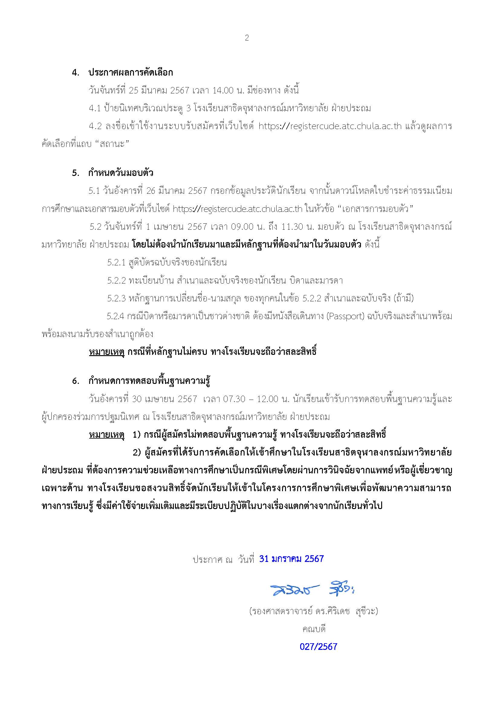 3.2 กำหนดรอบเวลาการคัดเลือก ขอให้ผู้ปกครองดูประกาศรายละเอียดได้ที่เว็บไซต์ https://registercude.atc.chula.ac.th ในวันพฤหัสบดีที่ 14 มีนาคม 2567 ตั้งแต่เวลา 09.00 น.เป็นต้นไป