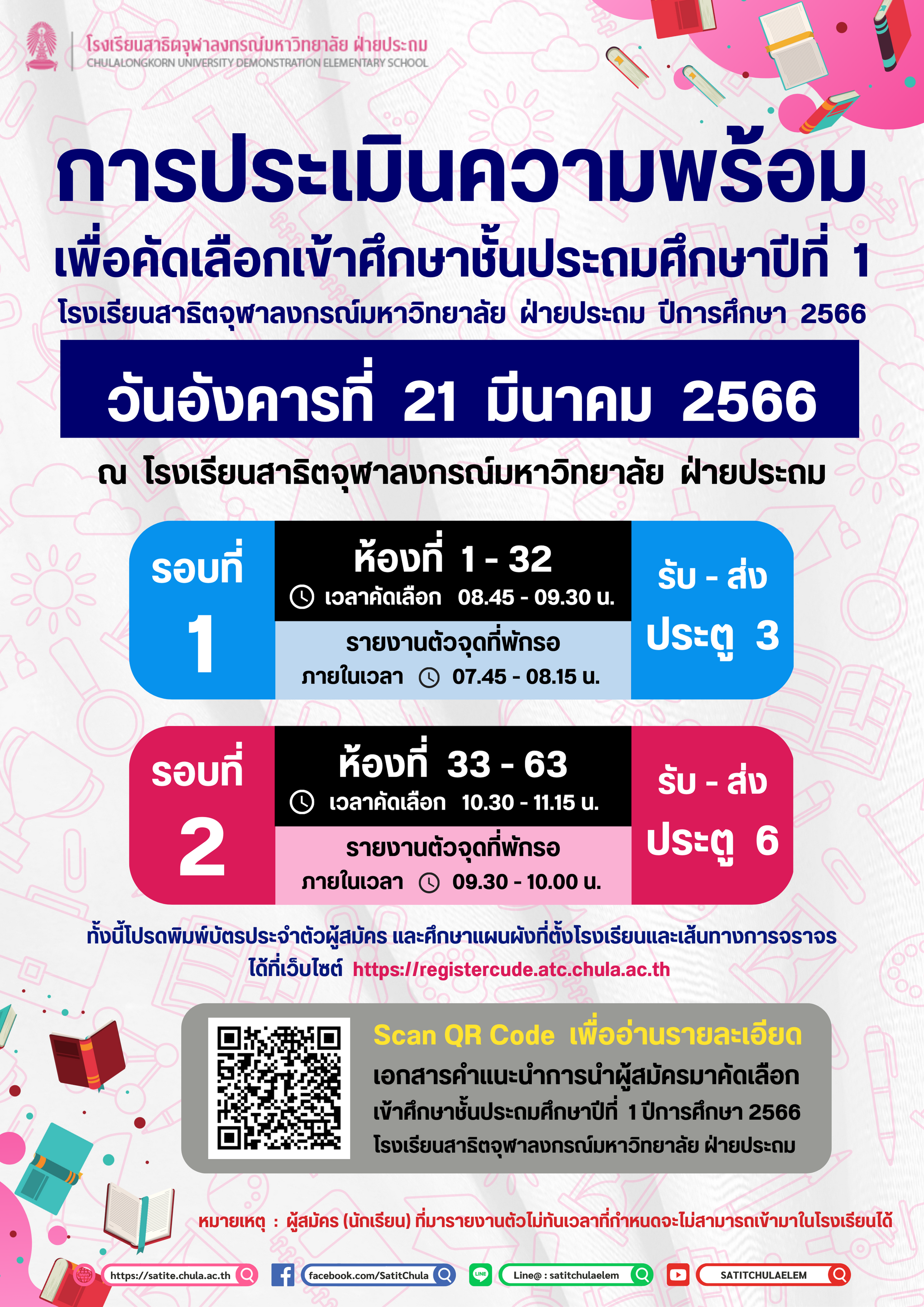 ทั้งนี้โปรดพิมพ์บัตรประจำตัวผู้สมัคร และศึกษาแผนผังที่ตั้งโรงเรียนและเส้นทางการจราจรได้ที่เว็บไซต์ https://registercude.atc.chula.ac.th