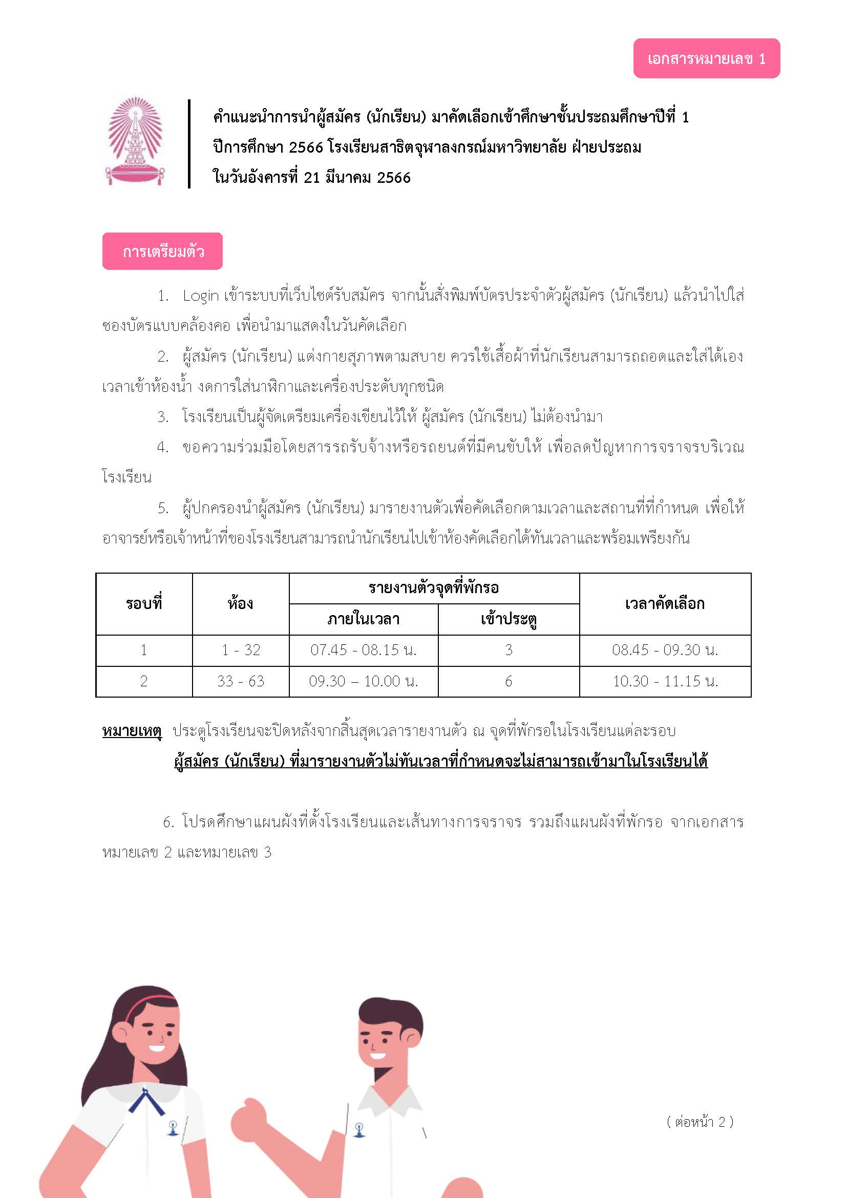 คำแนะนำการนำผู้สมัคร (นักเรียน) มาคัดเลือกเข้าศึกษาชั้นประถมศึกษาปีที่ 1 ปีการศึกษา 2566 โรงเรียนสาธิตจุฬาลงกรณ์มหาวิทยาลัย ฝ่ายประถม
