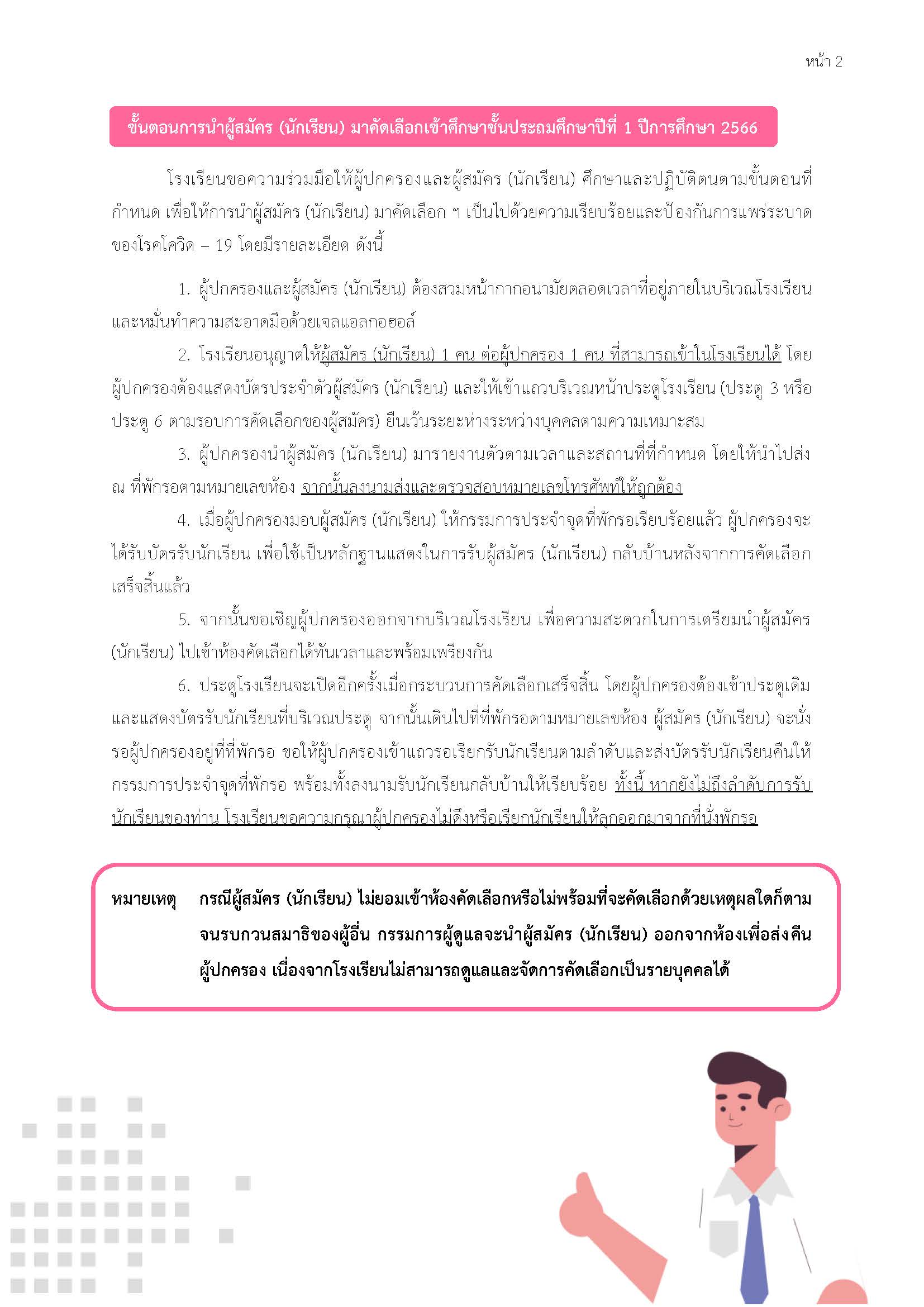 หมายเหตุ : กรณีผู้สมัคร (นักเรียน) ไม่ยอมเข้าห้องคัดเลือกหรือไม่พร้อมที่จะคัดเลือกด้วยเหตุผลใดก็ตามจนรบกวนสมาธิของผู้อื่น กรรมการผู้ดูแลจะนำผู้สมัคร (นักเรียน) ออกจากห้องเพื่อส่งคืนผู้ปกครอง เนื่องจากโรงเรียนไม่สามารถดูแลและจัดการคัดเลือกเป็นรายบุคคลได้