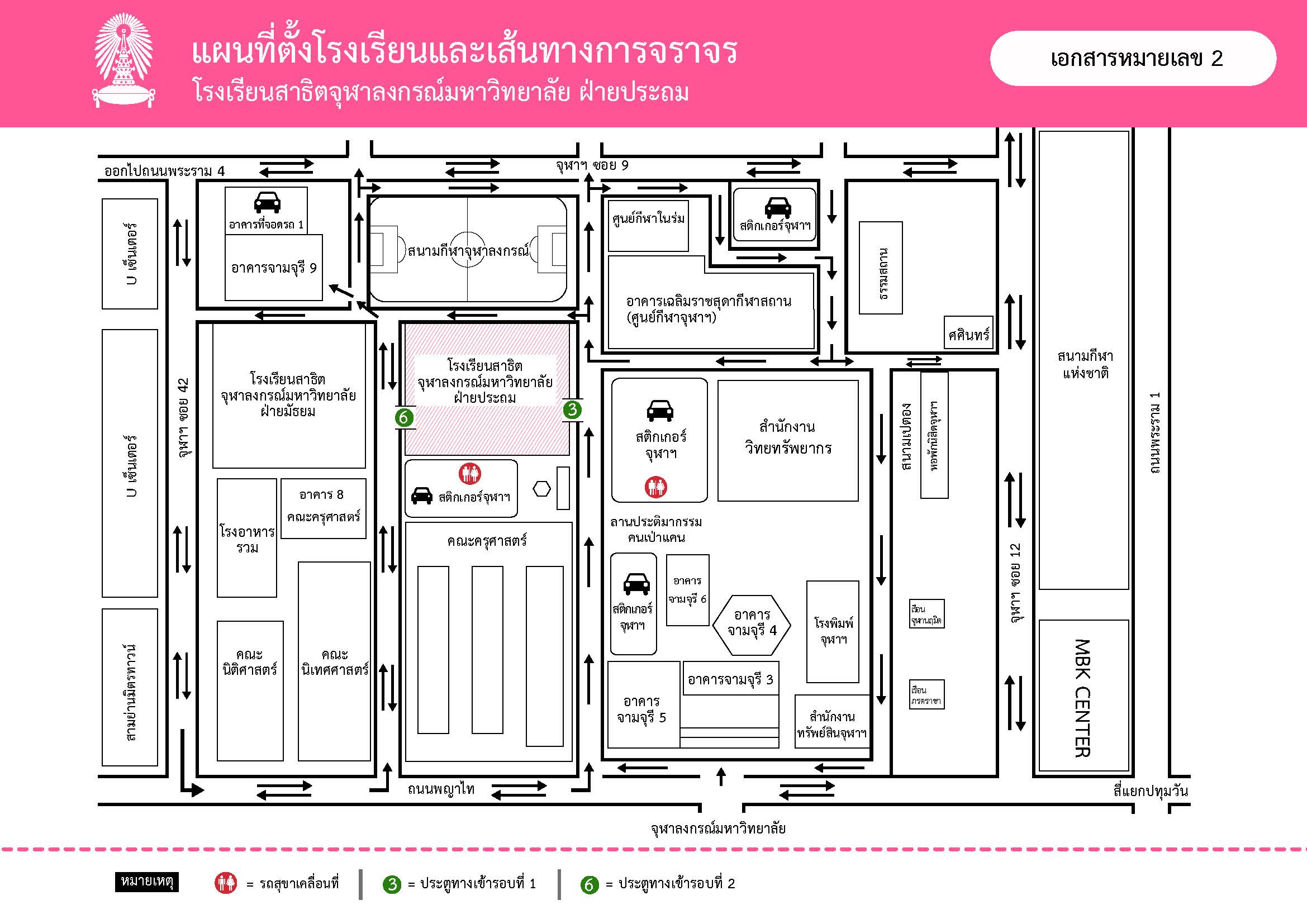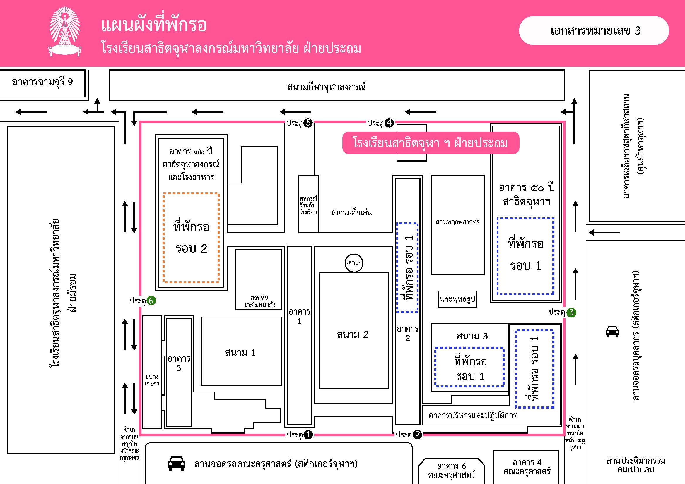 6. โปรดศึกษาแผนผังที่ตั้งโรงเรียนและเส้นทางการจราจร รวมถึงแผนผังที่พักรอ จากเอกสารหมายเลข 2 และหมายเลข 3