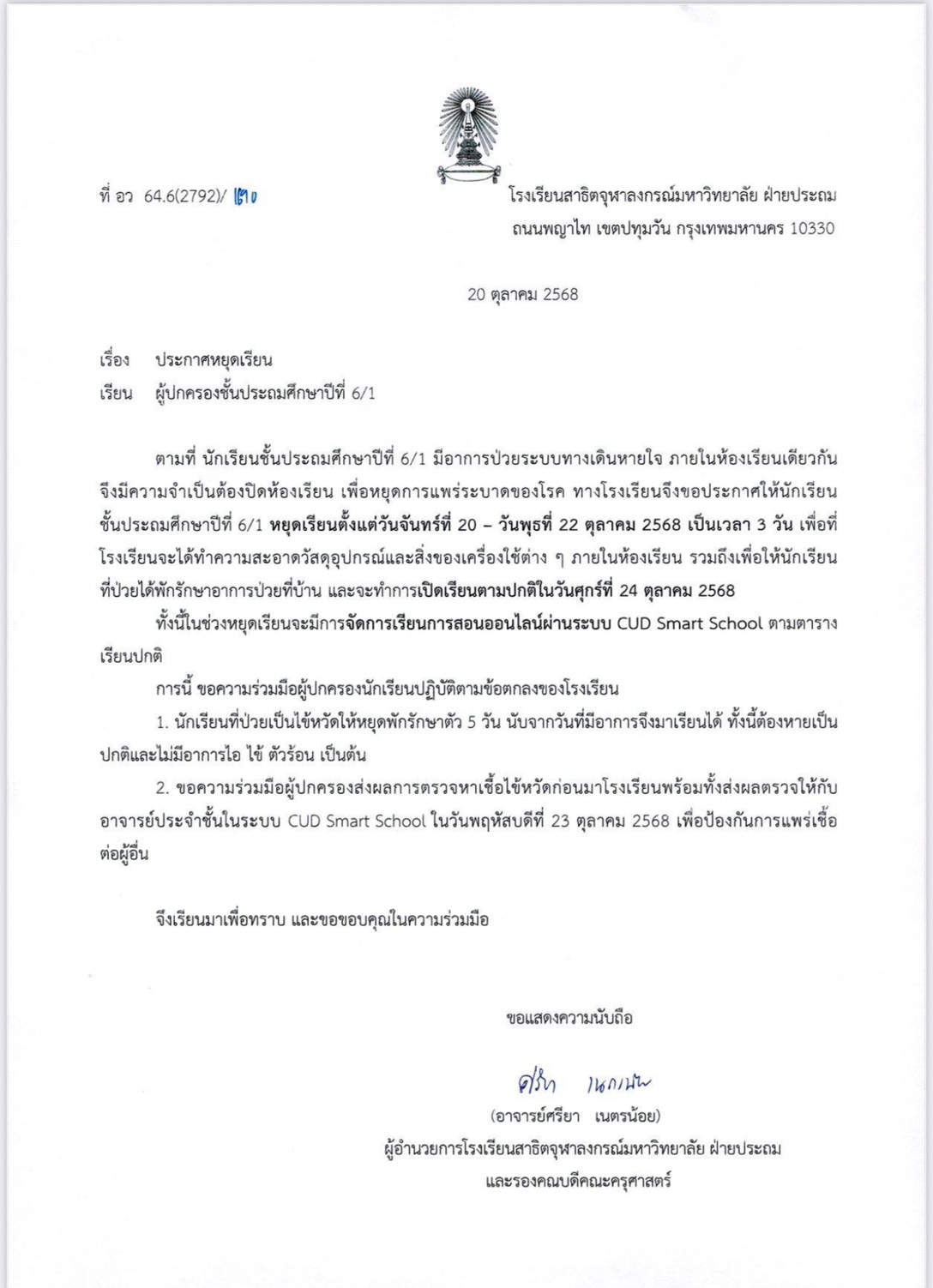 ฝ่ายวิชาการ หลักสูตรและการสอน ขอแจ้งปิดกิจกรรม วิชา Fit for Fun กลุ่ม 2 ( เรียนวันพุธ ) โครงการหลังเลิกเรียน CUD After School ภาคปลาย ปีการศึกษา 2568