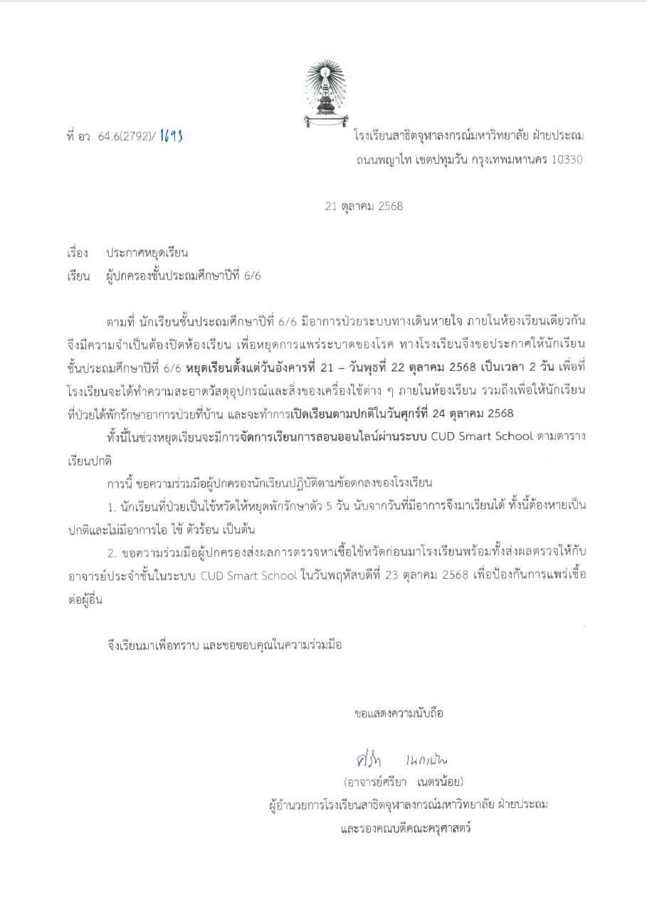 เรียน ผู้ปกครองนักเรียนโรงเรียนสาธิตจุฬาลงกรณ์มหาวิทยาลัย ฝ่ายประถม ท่านสามารถดูคะแนนสอบ ผลการเรียน และสมุดรายงานประจำตัวผู้เรียน (สมุดพก) ของนักเรียนทุกระดับชั้น ประจำภาคต้น ปีการศึกษา [...]