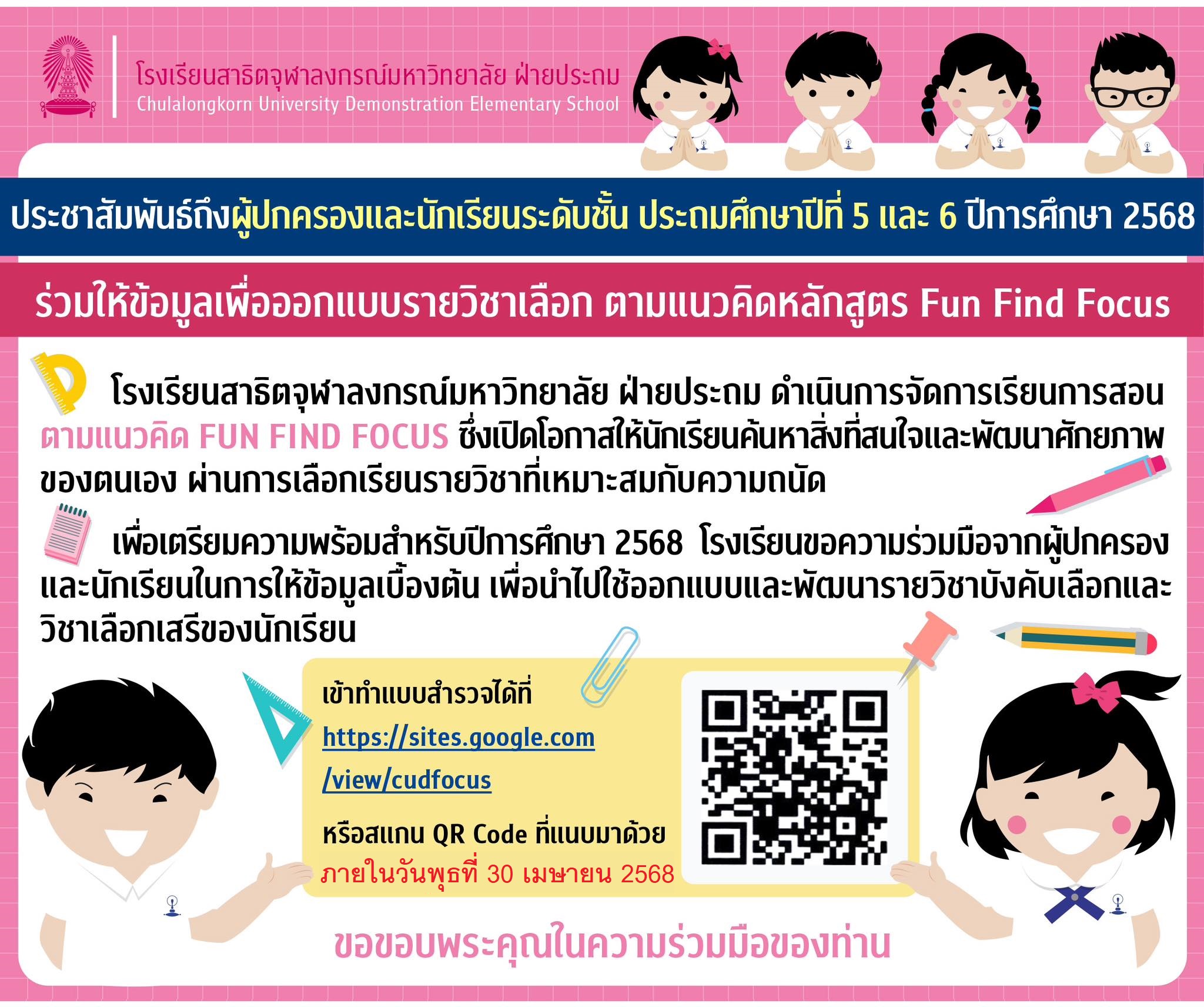 ประชาสัมพันธ์ถึงผู้ปกครองและนักเรียนระดับชั้นประถมศึกษาปีที่ 5 และ 6 ปีการศึกษา 2568 ร่วมให้ข้อมูลเพื่อออกแบบรายวิชาเลือก ตามแนวคิดหลักสูตร Fun Find Focus