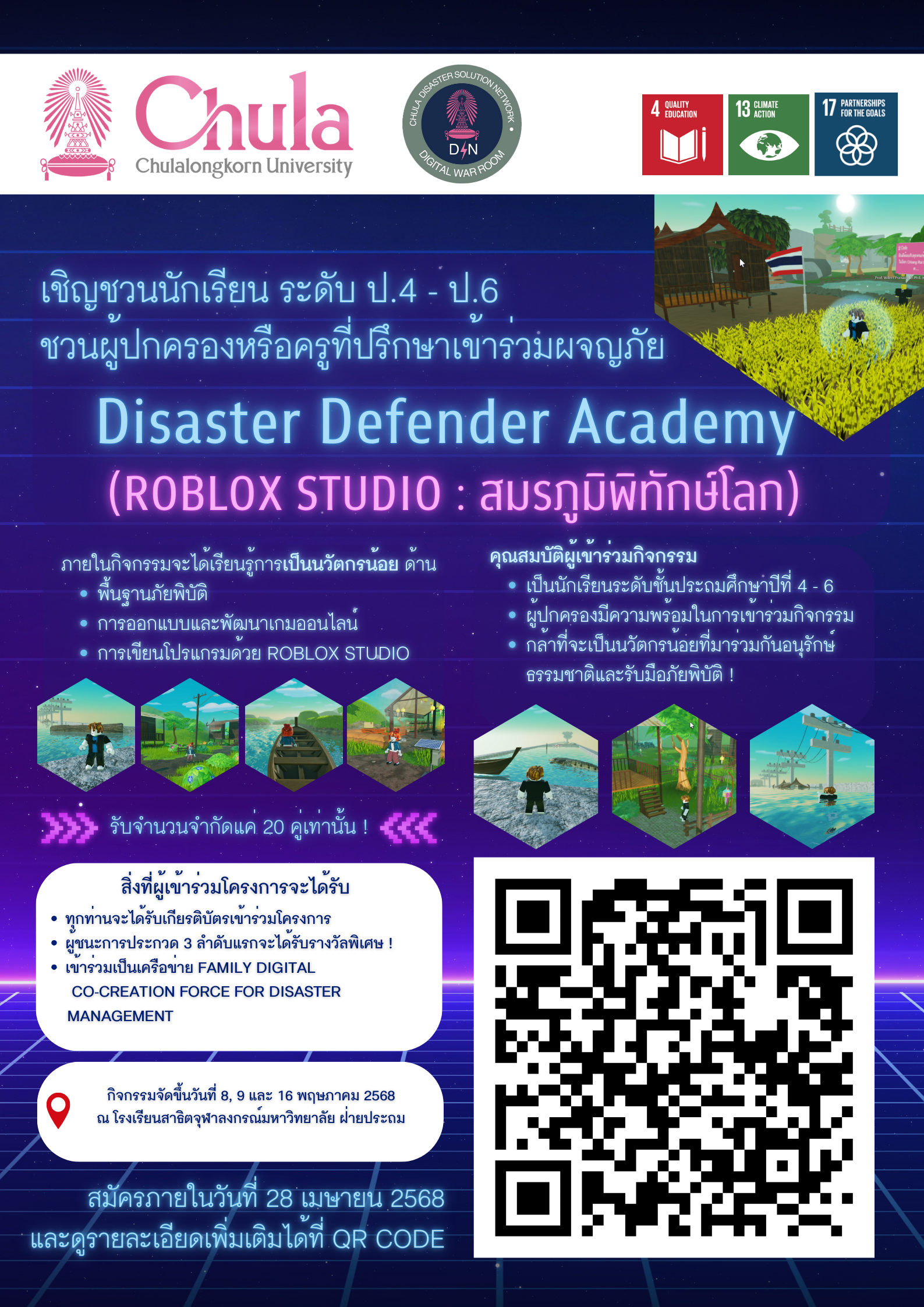 จุฬาลงกรณ์มหาวิทยาลัยขอเชิญชวนนักเรียนระดับ ป.4 – ป.6 และขอเชิญชวนผู้ปกครองหรือครูที่ปรึกษาเข้าร่วมผจญภัย “Disaster Defender Academy (Roblox Studio : สมรภูมิพิทักษ์โลก)