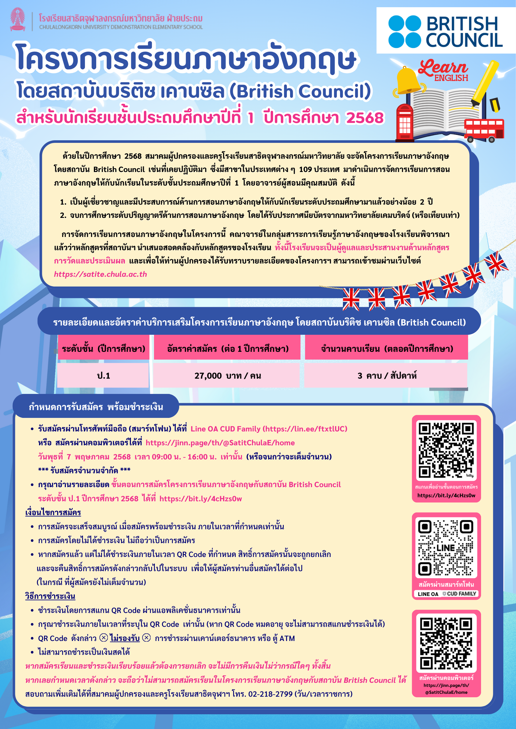 โครงการเรียนภาษาอังกฤษ โดยสถาบัน British Council สำหรับชั้นประถมศึกษาปีที่ 1 ปีการศึกษา 2568