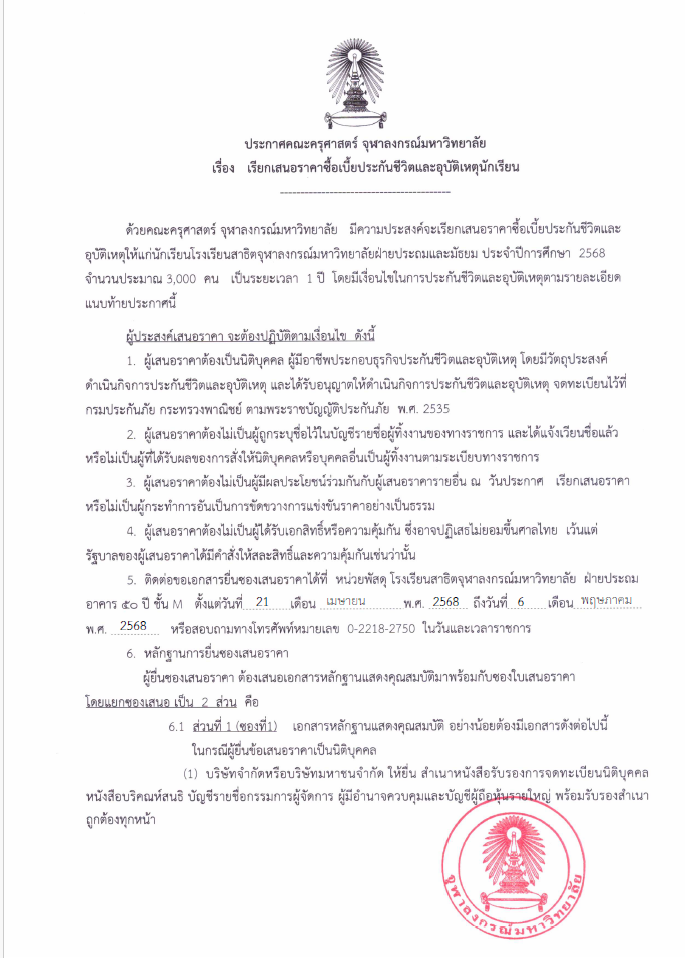 ประกาศคณะครุศาสตร์ จุฬาลงกรณ์มหาวิทยาลัย เรื่อง เรียกเสนอราคาซื้อเบี้ยประกันชีวิตและอุบัติเหตุนักเรียน