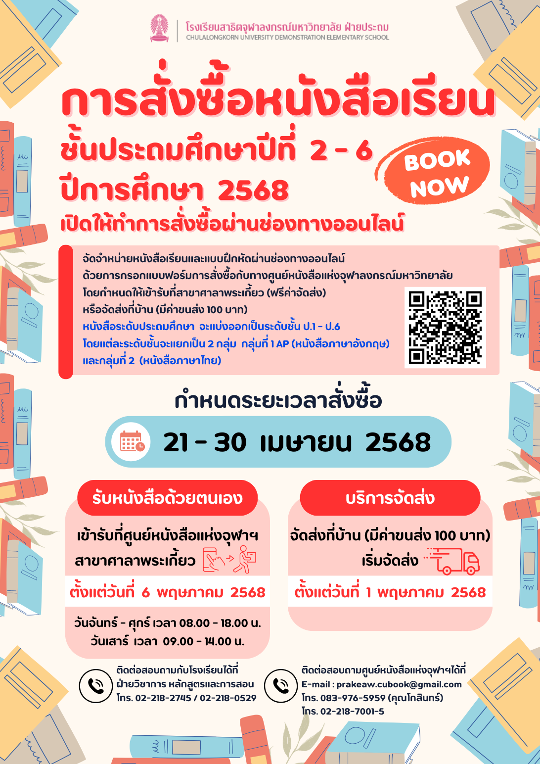 โรงเรียนสาธิตจุฬาลงกรณ์มหาวิทยาลัย ฝ่ายประถม เปิดให้ทำการสั่งซื้อหนังสือเรียนชั้นประถมศึกษาปีที่ 2 – 6 ปีการศึกษา 2568 ผ่านช่องทางออนไลน์