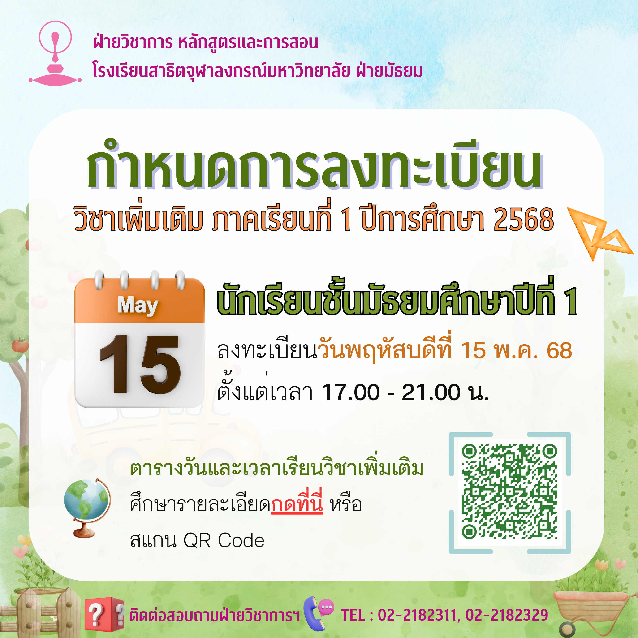 การลงทะเบียน วิชาเพิ่มเติม ภาคเรียนที่ 1 ปีการศึกษา 2568 สำหรับนักเรียนชั้นมัธยมศึกษาปีที่ 1 โรงเรียนสาธิตจุฬาลงกรณ์มหาวิทยาลัย ฝ่ายมัธยม