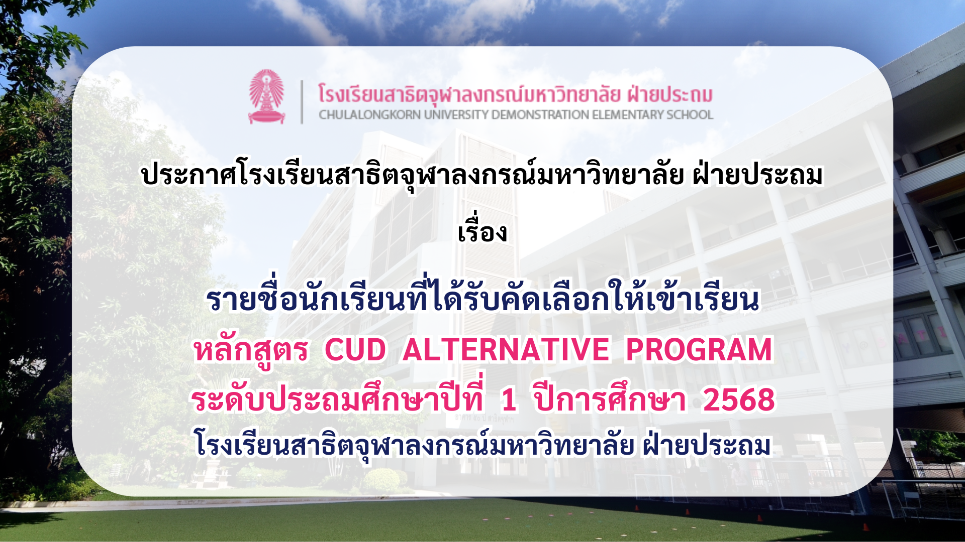 ประกาศรายชื่อนักเรียนที่ได้รับคัดเลือกให้เข้าเรียนหลักสูตร CUD ALTERNATIVE PROGRAM ระดับประถมศึกษาปีที่ 1 ปีการศึกษา 2568 โรงเรียนสาธิตจุฬาลงกรณ์มหาวิทยาลัย ฝ่ายประถม