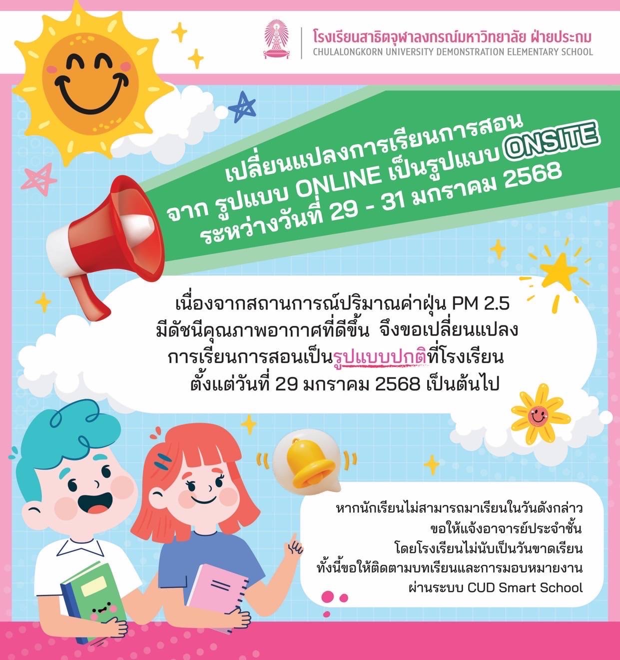 ขอแจ้งเปลี่ยนแปลงการเรียนการสอน จากรูปแบบ ONLINE เป็นรูปแบบ ONSITE ระหว่างวันที่ 29 – 31 มกราคม 2568 เนื่องจากสถานการณ์ปริมาณค่าฝุ่น PM 2.5 มีดัชนีคุณภาพอากาศที่ดีขึ้น จึงขอเปลี่ยนแปลงการเรียนการสอนเป็นรูปแบบปกติที่โรงเรียนตั้งแต่วันที่ 29 มกราคม 2568 เป็นต้นไป