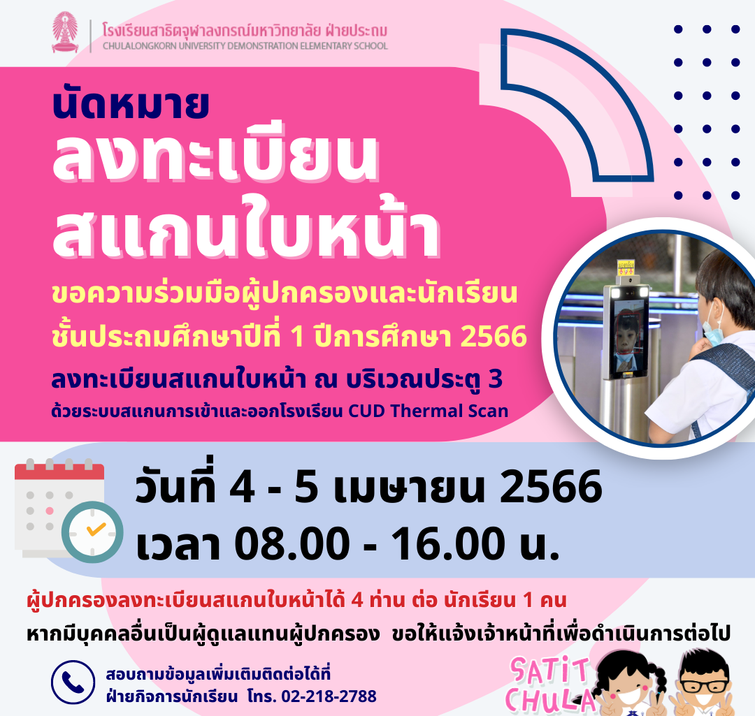 ฝ่ายกิจการนักเรียน ขอความร่วมมือผู้ปกครองและนักเรียนชั้นประถมศึกษาปีที่ 1 ปีการศึกษา 2566 ลงทะเบียนสแกนใบหน้า ณ บริเวณประตู 3 ด้วยระบบสแกนการเข้าและออกโรงเรียน CUD Thermal Scan