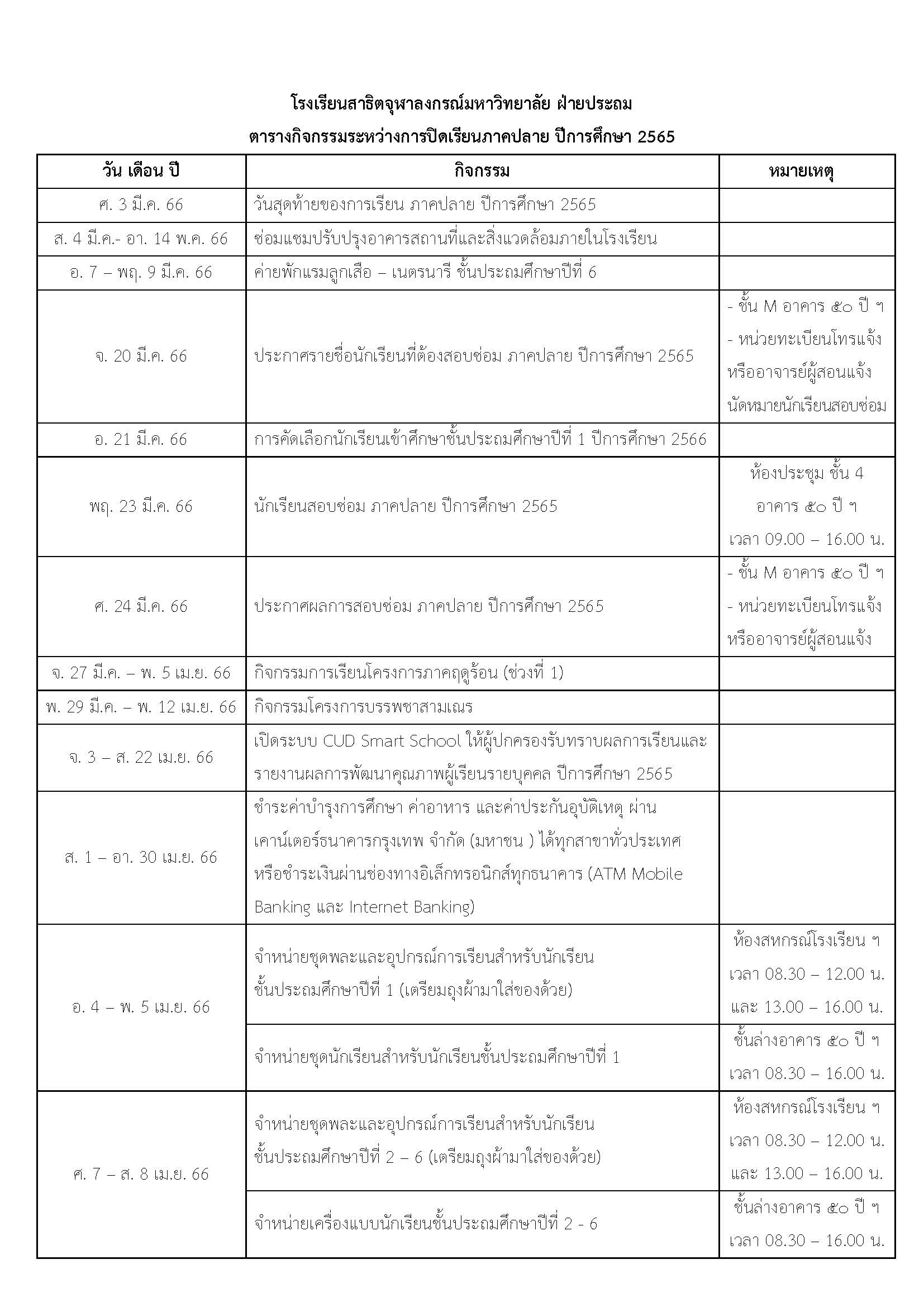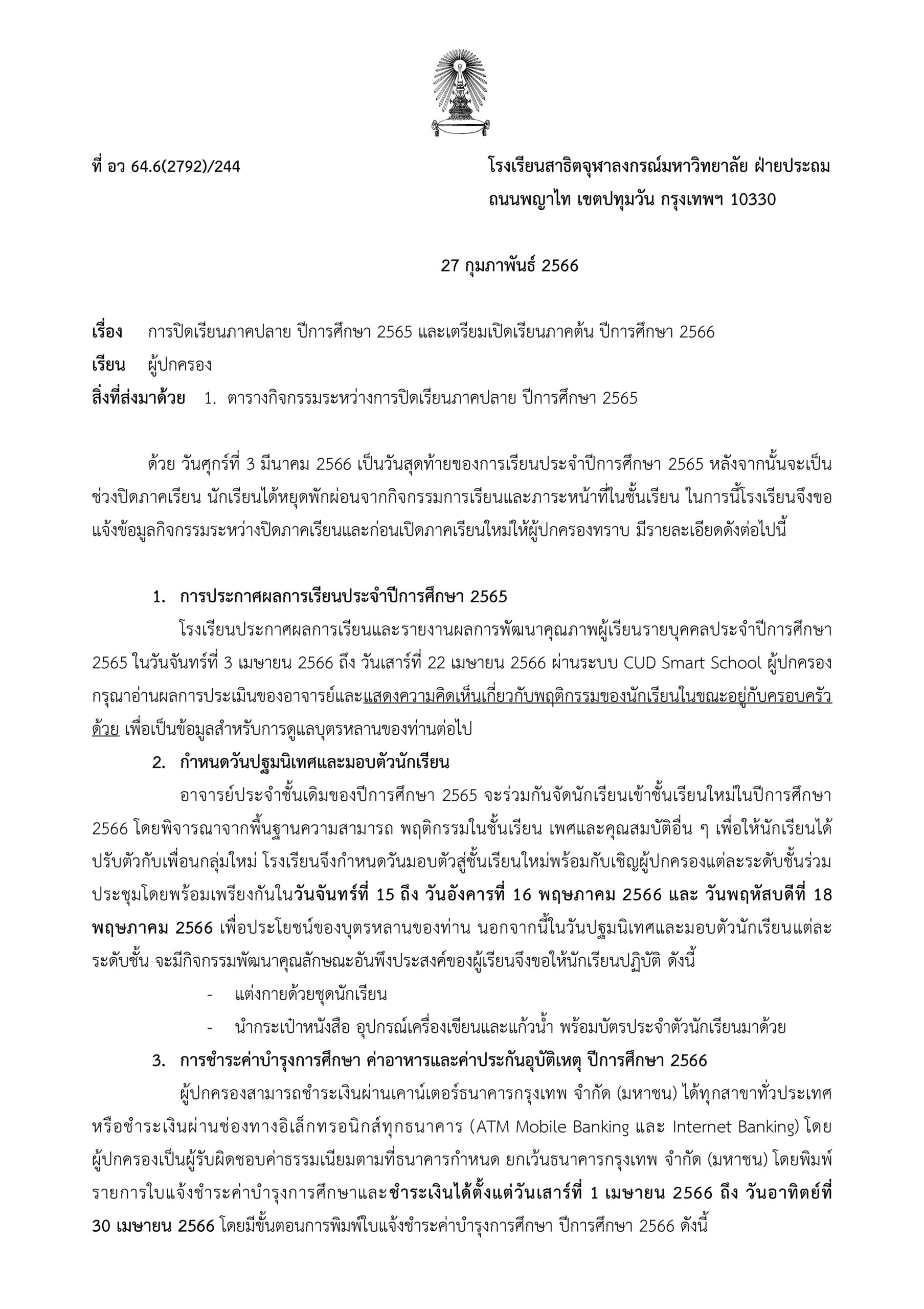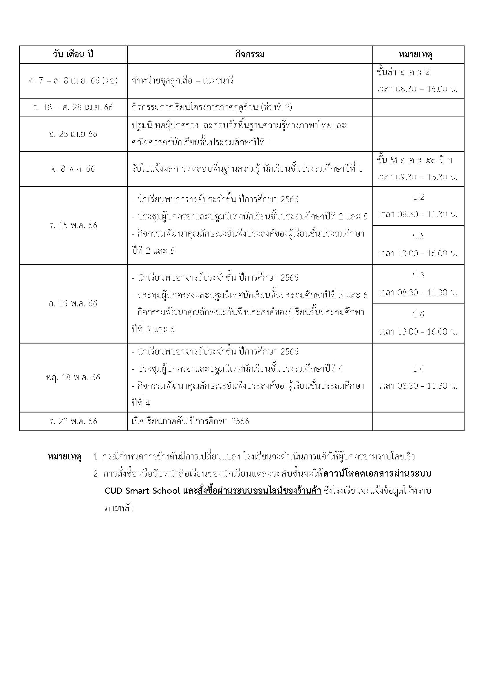 รับชุดนักเรียน : วันพุธที่ 3 พฤษภาคม 2566 ที่ชั้นล่างอาคาร ๕๐ ปี สาธิตจุฬาฯ เวลา 09.00 – 12.00 น.