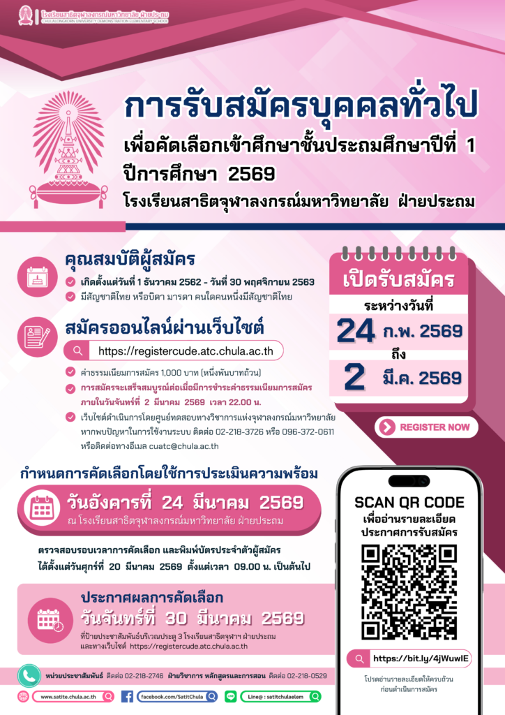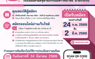 การรับสมัครบุคคลทั่วไปเพื่อคัดเลือกเข้าศึกษาชั้นประถมศึกษาปีที่ 1 โรงเรียนสาธิตจุฬาลงกรณ์มหาวิทยาลัย ฝ่ายประถม ปีการศึกษา 2569Web Master2026-01-26T16:09:22+07:00January 26, 2026|Read More