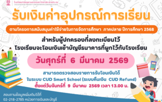 การรับเงินค่าอุปกรณ์การเรียนตามโครงการสนับสนุนค่าใช้จ่ายในการจัดการศึกษา ภาคปลาย ปีการศึกษา 2568Web Master2026-03-06T11:15:42+07:00March 6, 2026|Read More