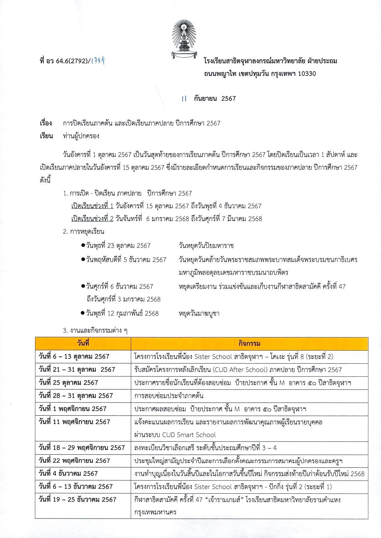 จดหมายโรงเรียน เรื่อง การปิดเรียนภาคต้น และเปิดเรียนภาคปลาย ปีการศึกษา 2567