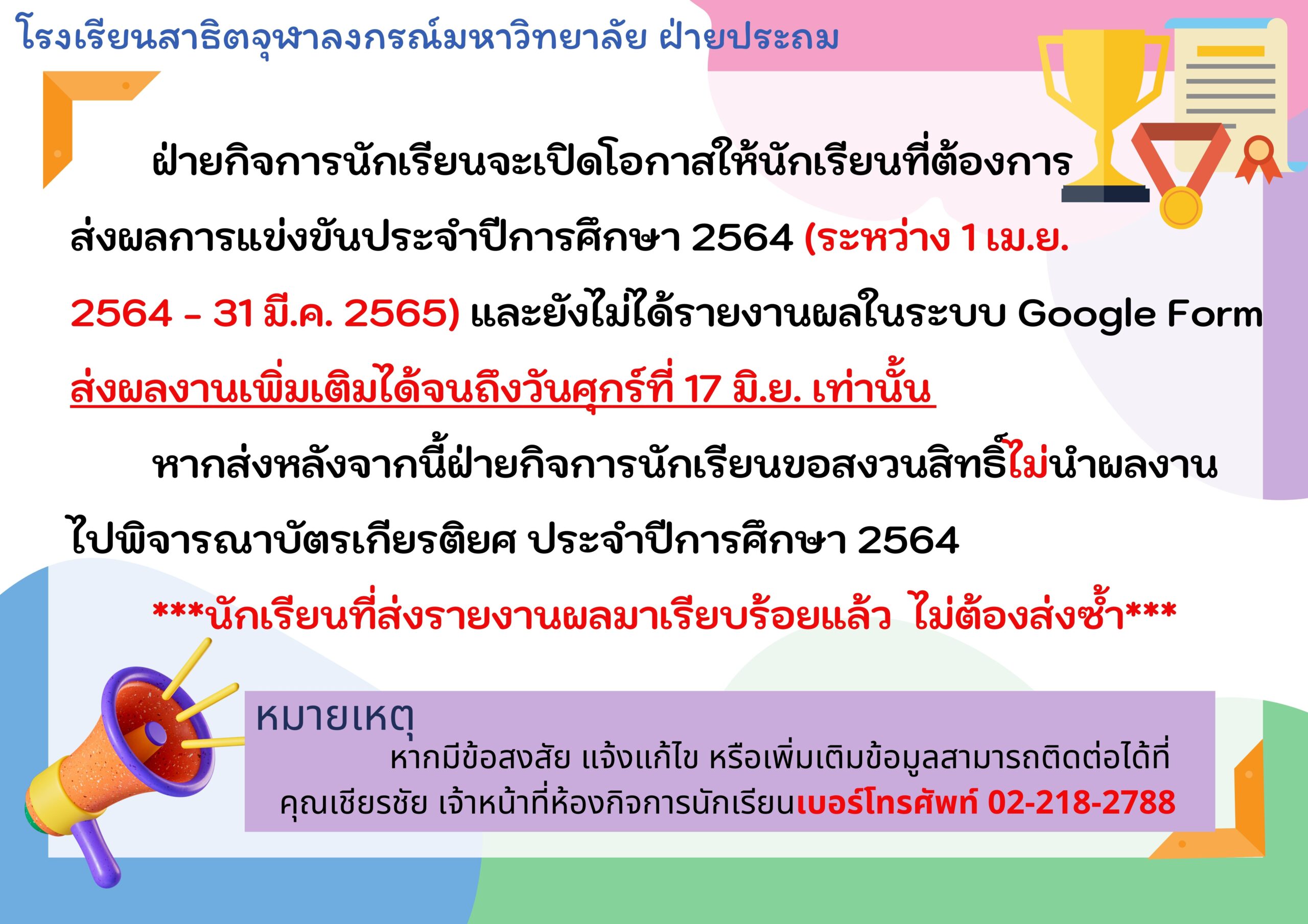 หมายเหตุ : หากมีข้อสงสัย แจ้งแก้ไข หรือเพิ่มเติมข้อมูลสามารถติดต่อได้ที่ คุณเชียรชัย เจ้าหน้าที่ห้องกิจการนักเรียน เบอร์โทรศัพท์ 02-218-2788