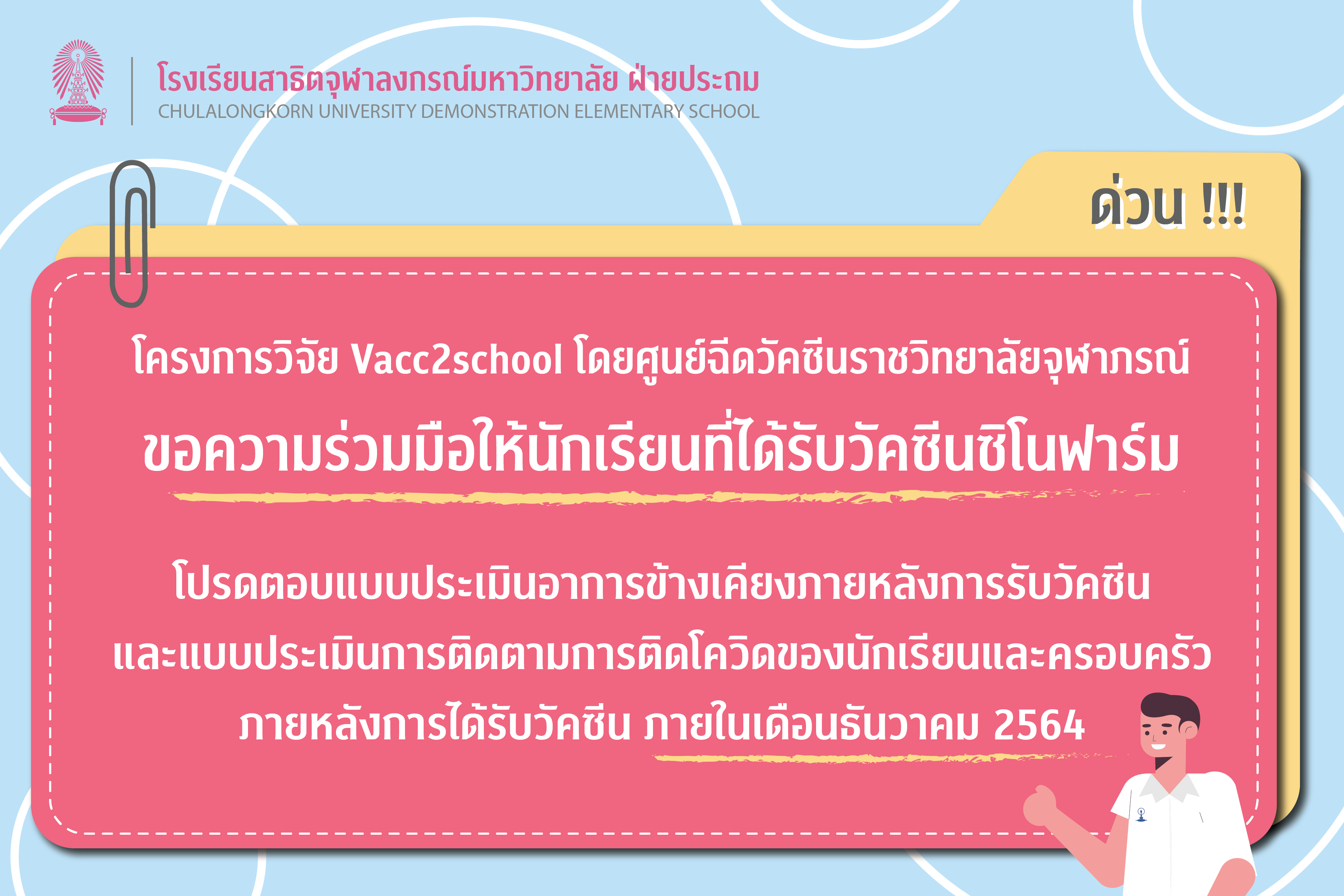 ขอความร่วมมือนักเรียนที่ได้รับวัคซีนซิโนฟาร์ม โปรดตอบแบบประเมินอาการข้างเคียงและแบบประเมินการติดตามการติดโควิดภายในเดือนธันวาคม 2564 By Web Master|2022-03-14T03:20:48+07:00December 22, 2021|ข่าวประชาสัมพันธ์| View Larger Image