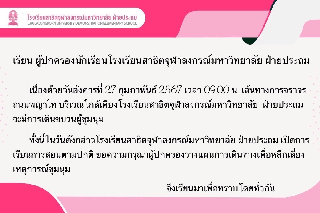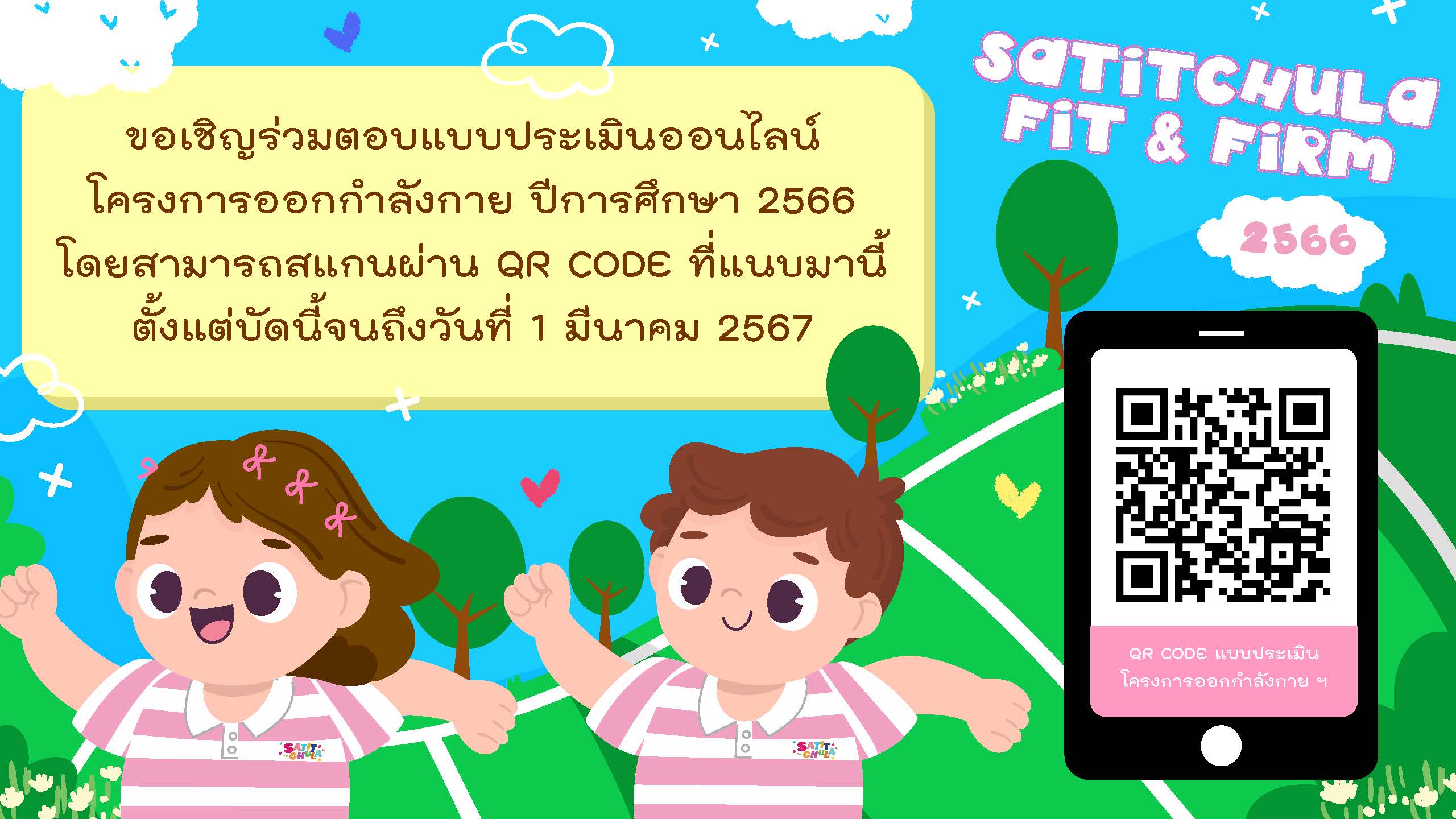 โรงเรียนสาธิตจุฬาลงกรณ์มหาวิทยาลัย ฝ่ายประถม ขอเชิญร่วมตอบแบบประเมินออนไลน์ โครงการออกกำลังกาย ปีการศึกษา 2566 โดยสามารถสแกนผ่าน QR CODE ที่แนบมานี้ ตั้งแต่บัดนี้จนถึงวันที่ 1 มีนาคม 2567Web Master2024-02-22T20:07:53+07:00February 22, 2024|