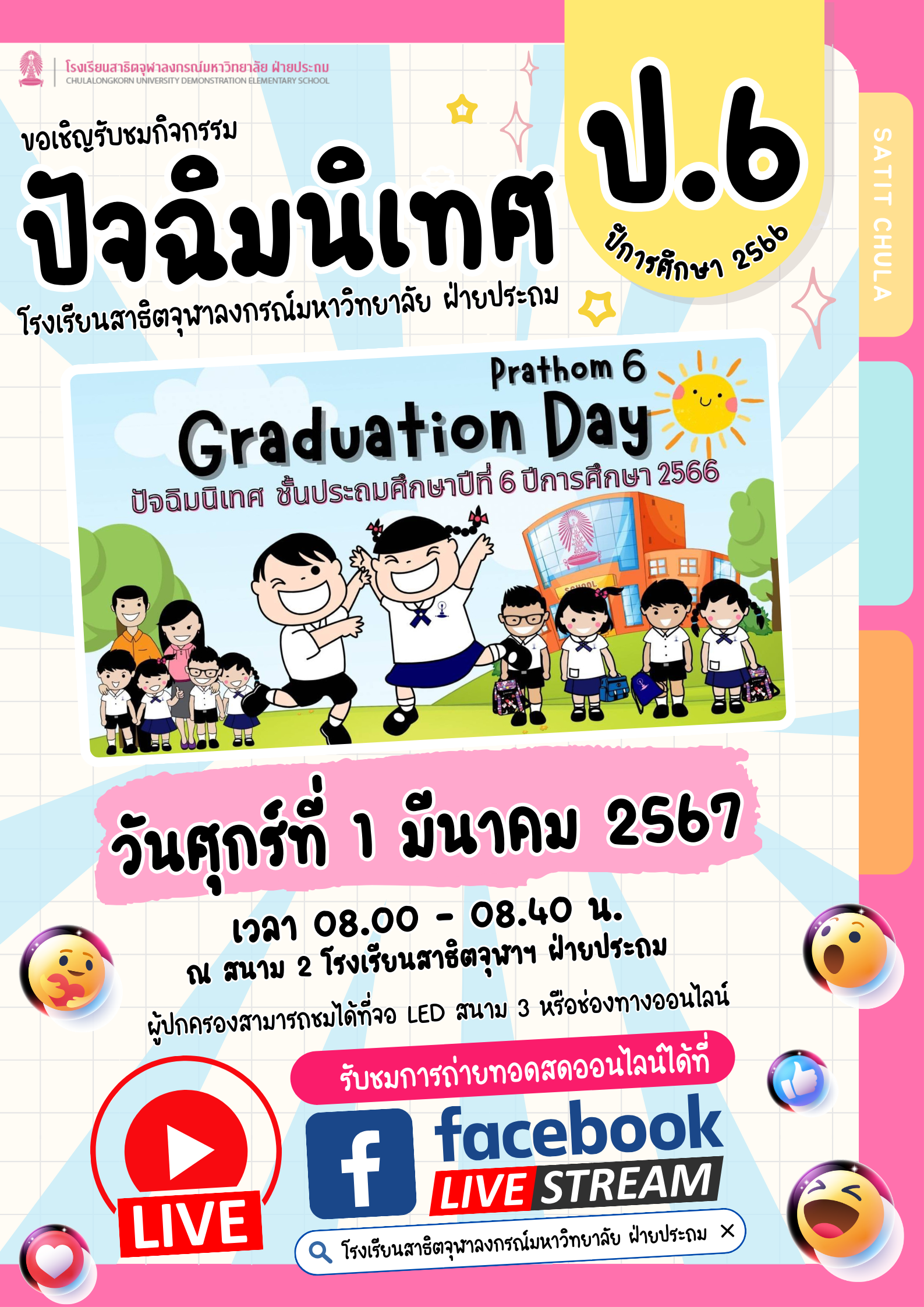 โรงเรียนสาธิตจุฬาลงกรณ์มหาวิทยาลัย ฝ่ายประถม ขอเชิญคณาจารย์ บุคลากร นักเรียน และผู้ปกครอง รับชมกิจกรรมปัจฉิมนิเทศนักเรียนระดับชั้นประถมศึกษาปีที่ 6 ปีการศึกษา 2566Web Master2024-02-29T15:17:36+07:00February 29, 2024|