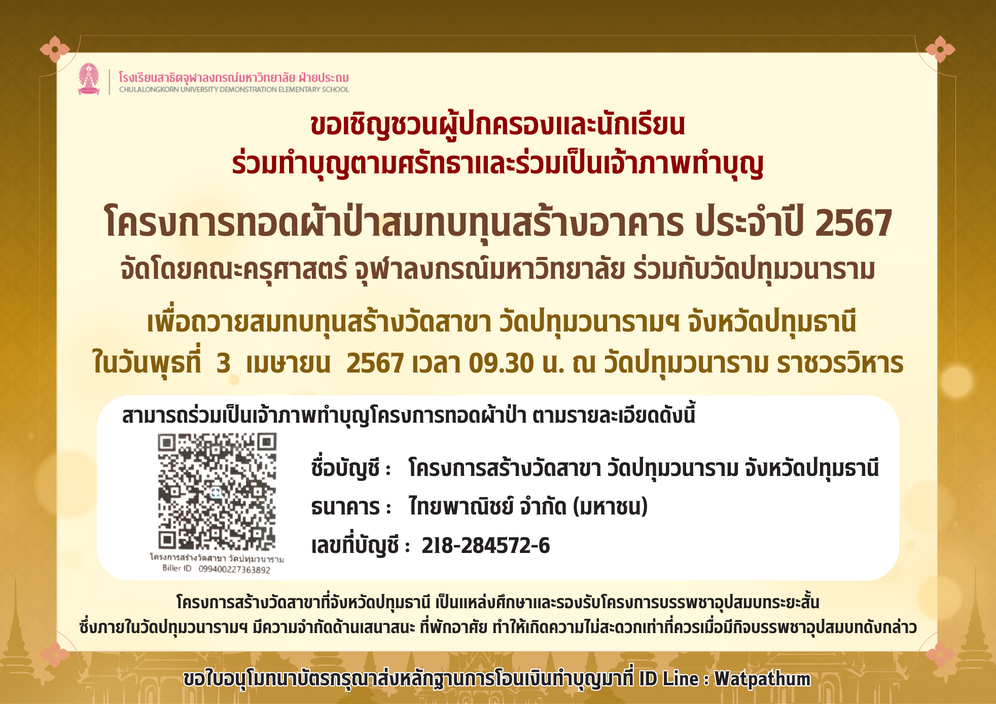 ขอเชิญชวนผู้ปกครองและนักเรียน ร่วมทำบุญตามศรัทธาและร่วมเป็นเจ้าภาพทำบุญ โครงการทอดผ้าป่าสมทบทุนสร้างอาคาร ประจำปี 2567 จัดโดยคณะครุศาสตร์ จุฬาลงกรณ์มหาวิทยาลัย ร่วมกับวัดปทุมวนาราม เพื่อถวายสมทบทุนสร้างวัดสาขา วัดปทุมวนารามฯ จังหวัดปทุมธานีWeb Master2024-02-29T12:23:53+07:00February 29, 2024|
