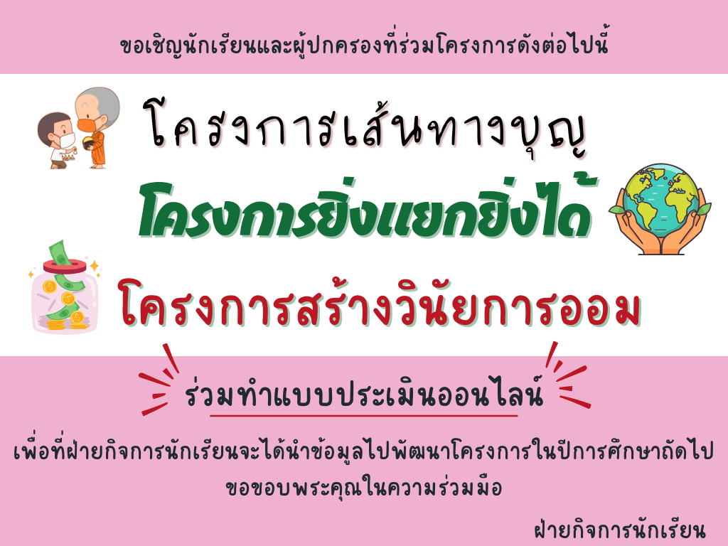 ฝ่ายกิจการนักเรียน โรงเรียนสาธิตจุฬาลงกรณ์มหาวิทยาลัย ฝ่ายประถม ขอเชิญนักเรียนและผู้ปกครองที่ร่วมโครงการดังต่อไปนี้ ร่วมทำแบบประเมินออนไลน์ เพื่อที่ฝ่ายกิจการนักเรียนจะได้นำข้อมูลไปพัฒนาโครงการในปีการศึกษาถัดไปWeb Master2024-03-01T12:20:14+07:00March 1, 2024|