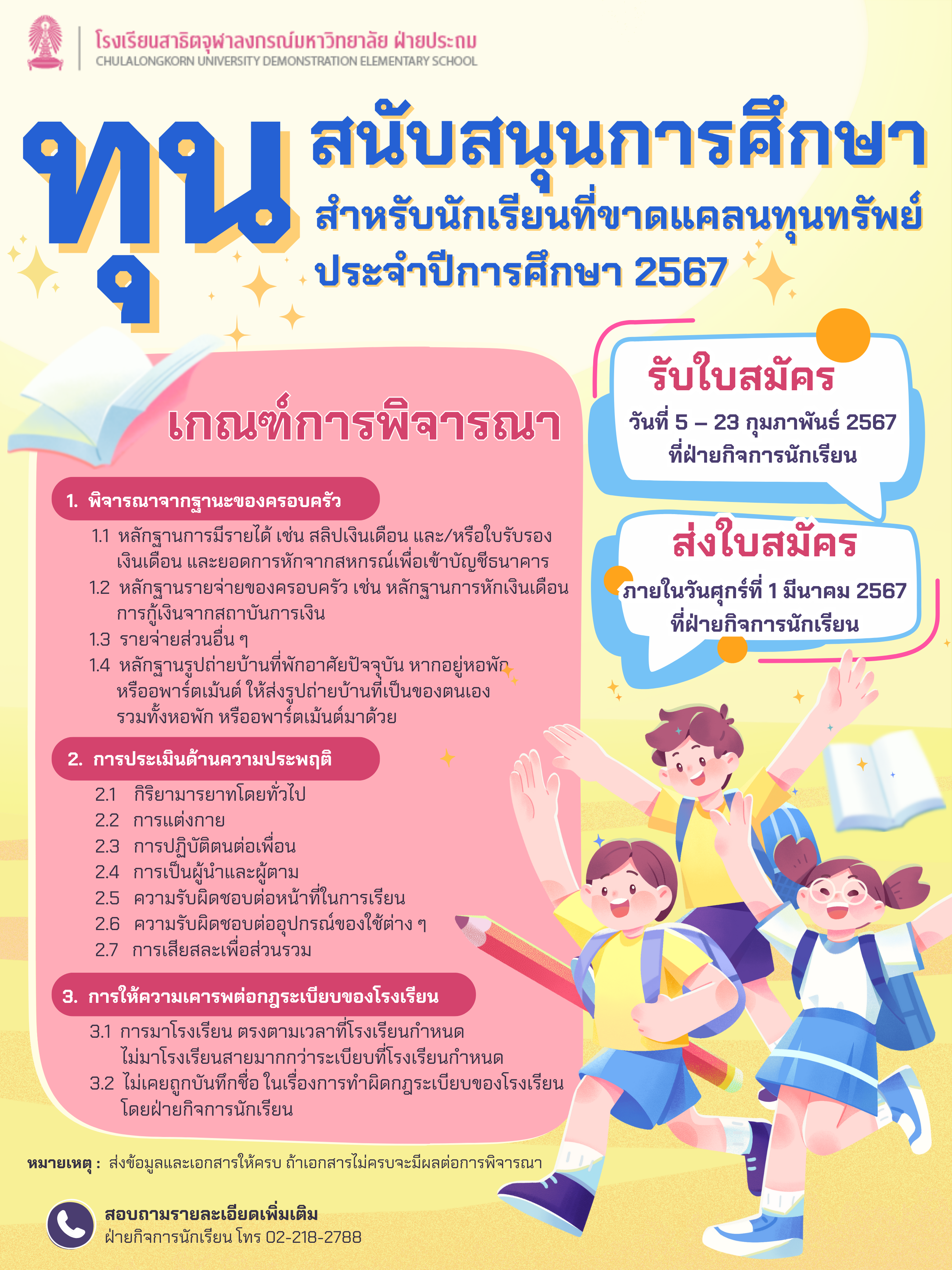 ประกาศรับสมัครทุนสนับสนุนการศึกษาสำหรับนักเรียนโรงเรียนสาธิตจุฬาลงกรณ์มหาวิทยาลัย ฝ่ายประถม ที่ขาดแคลนทุนทรัพย์ ปีการศึกษา 2567Web Master2024-02-13T12:29:00+07:00February 13, 2024|