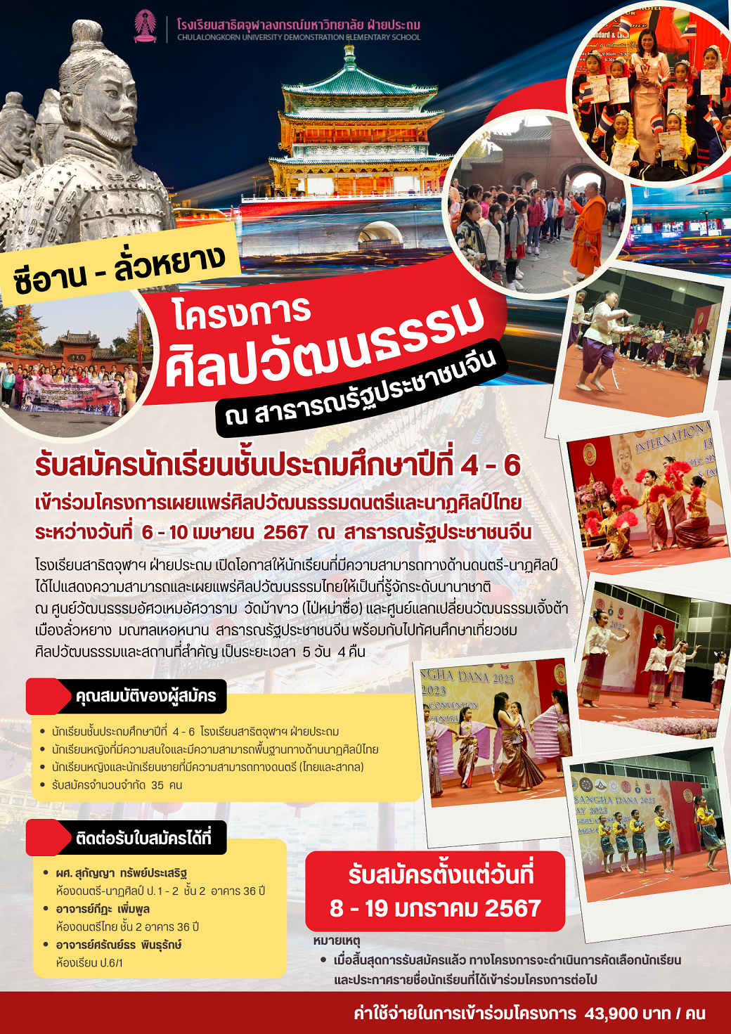 โครงการศิลปวัฒนธรรม เปิดรับสมัครนักเรียนชั้นประถมศึกษาปีที่ 4 – 6 เข้าร่วมโครงการเผยแพร่ศิลปวัฒนธรรมดนตรีและนาฏศิลป์ไทย ระหว่างวันที่ 6 – 10 เมษายน 2567 ณ สาธารณรัฐประชาชนจีนWeb Master2024-01-04T15:10:50+07:00January 4, 2024|