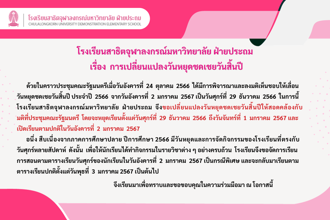 สมาคมผู้ปกครองและครูโรงเรียนสาธิตจุฬาลงกรณ์มหาวิทยาลัย ร่วมกับโรงเรียนสาธิตจุฬาลงกรณ์มหาวิทยาลัย ฝ่ายประถม ขอเชิญร่วมกิจกรรมปีใหม่ ปี 2567 “สาธิตจุฬาฯ สุขี ฤกษ์ดีปีมะโรง” ในวันศุกร์ที่ 12 มกราคม 2567Web Master2023-12-25T14:34:32+07:00December 25, 2023|