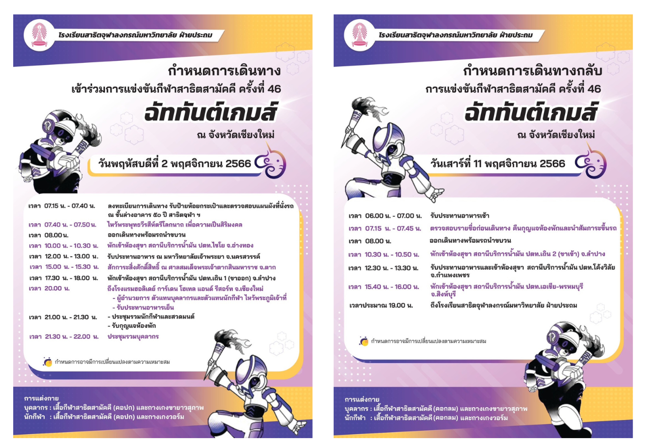 กำหนดการเดินทางไปและการเดินทางกลับ ของโรงเรียนสาธิตจุฬาลงกรณ์มหาวิทยาลัย ฝ่ายประถม ในการเข้าร่วมการแข่งขันกีฬาสาธิตสามัคคี ครั้งที่ 46 “ฉัททันต์เกมส์” ณ โรงเรียนสาธิตมหาวิทยาลัยเชียงใหม่ จังหวัดเชียงใหม่Web Master2023-10-27T15:33:49+07:00October 27, 2023|