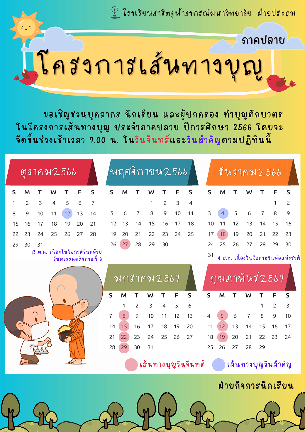 ฝ่ายกิจการนักเรียนขอเชิญชวนบุคลากร นักเรียน และผู้ปกครอง ร่วมทำบุญตักบาตร “โครงการเส้นทางบุญ” ประจำภาคปลาย ปีการศึกษา 2566Web Master2023-09-29T09:16:58+07:00September 29, 2023|