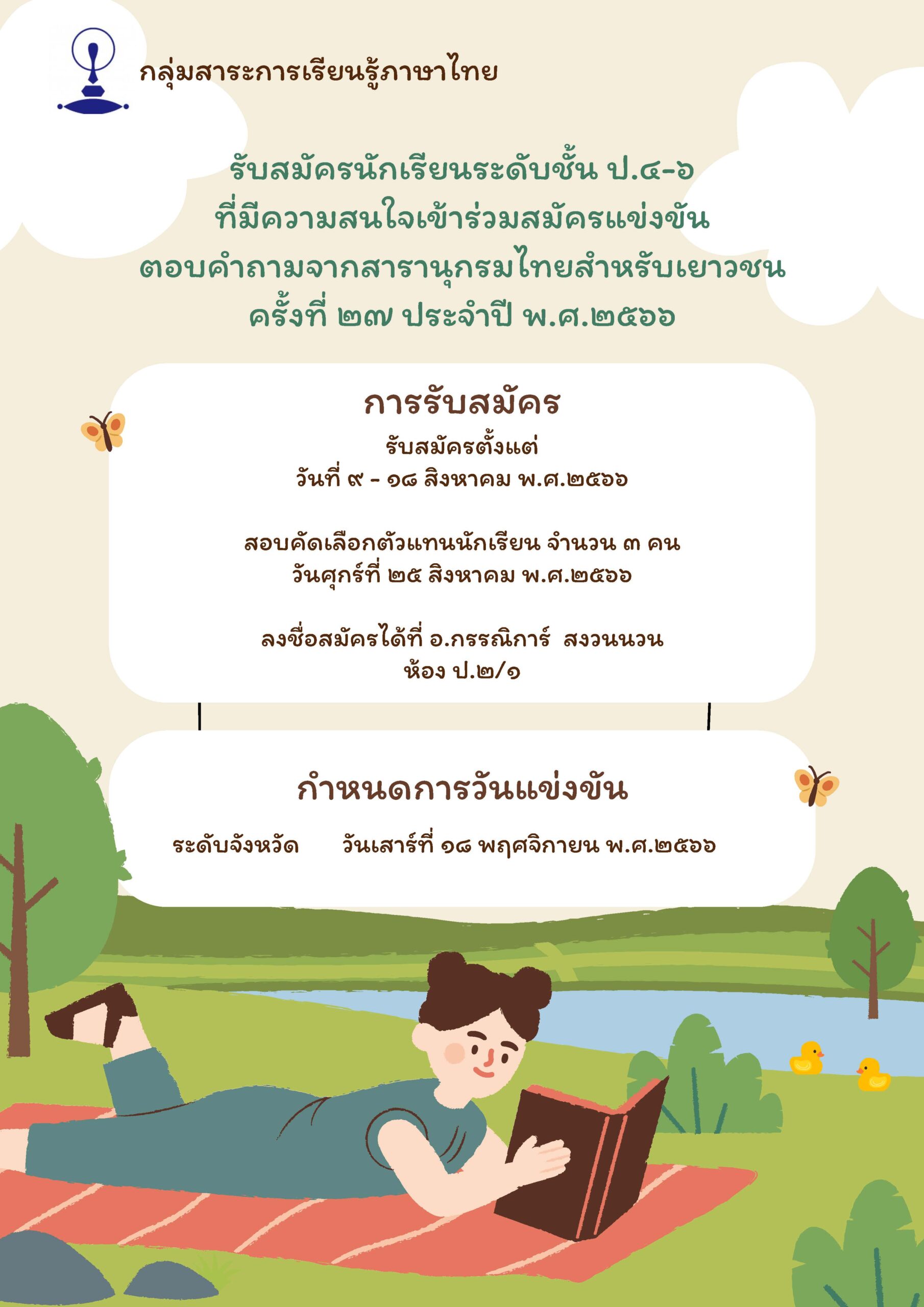 กลุ่มสาระการเรียนรู้ภาษาไทย โรงเรียนสาธิตจุฬาลงกรณ์มหาวิทยาลัย ฝ่ายประถม รับสมัครนักเรียนระดับชั้นประถมศึกษาปีที่ 4 – 6 ทืี่มีความสนใจเข้าร่วมสมัครการแข่งขันตอบคำถาม จากสารานุกรมไทยสำหรับเยาวชน ครั้งที่ 27 ประจำปี พ.ศ. 2566Web Master2023-08-09T18:48:49+07:00August 9, 2023|