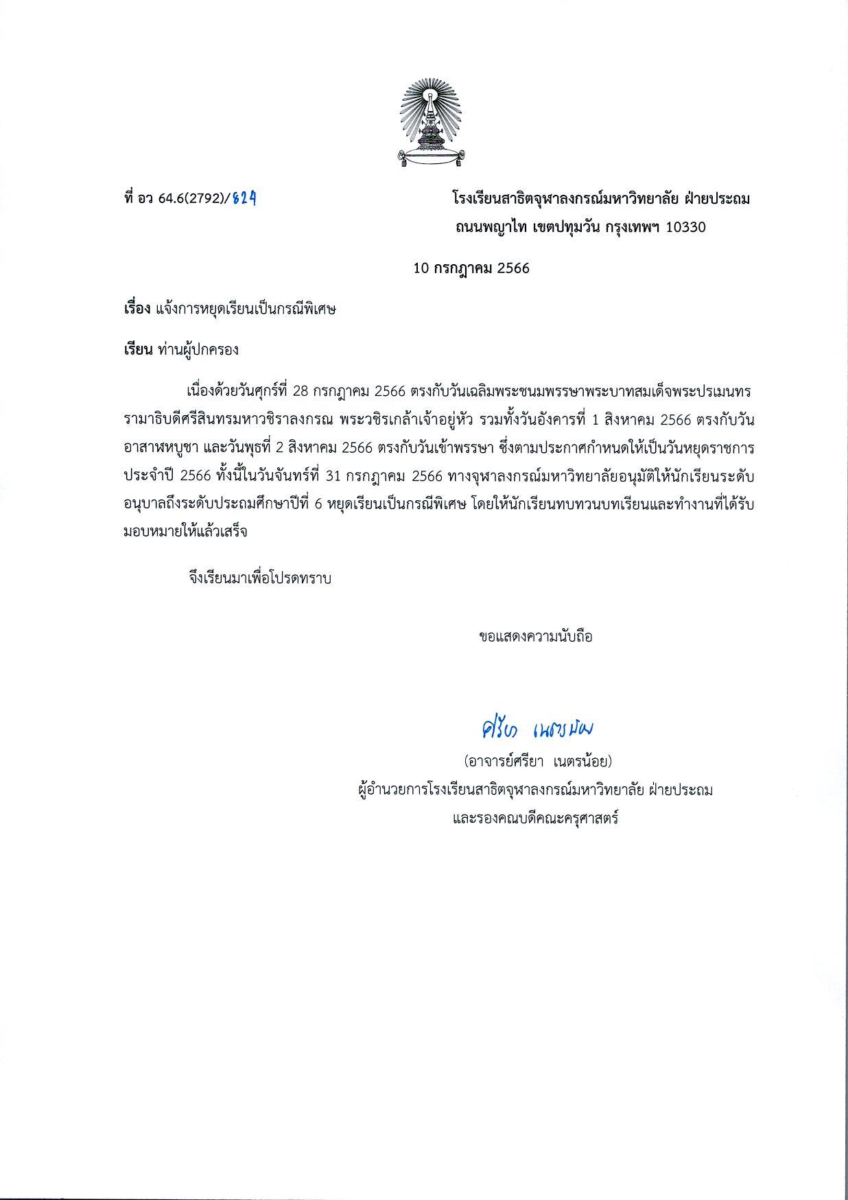 จดหมายโรงเรียน เรื่อง แจ้งการหยุดเรียนเป็นกรณีพิเศษ ในวันจันทร์ที่ 31 กรกฎาคม 2566Web Master2023-07-10T10:51:32+07:00July 10, 2023|