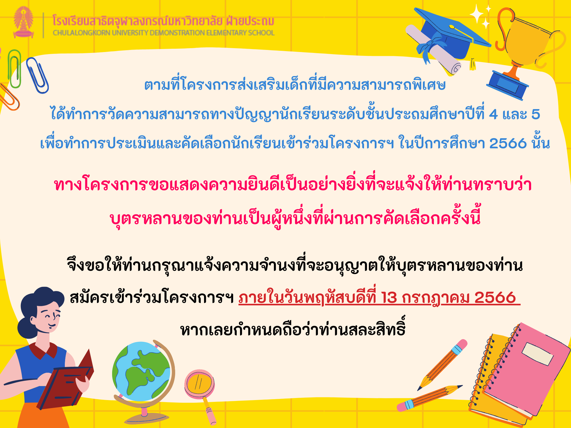รายชื่อนักเรียนผู้สอบวัดความสามารถทางปัญญา ที่ผ่านการคัดเลือกเข้าร่วมโครงการส่งเสริมเด็กที่มีความสามารถพิเศษ ปีการศึกษา 2566Web Master2023-07-10T16:25:34+07:00July 10, 2023|