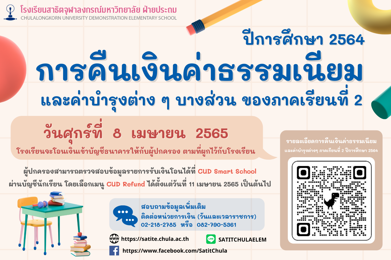 ตามที่มีการแพร่ระบาดของโรคติดเชื้อโควิด-19 โรงเรียนสาธิตจุฬาลงกรณ์มหาวิทยาลัย ฝ่ายประถม ได้จัดการเรียนการสอนออนไลน์ผ่านระบบ CUD Smart School ตลอดภาคเรียนที่ 2 ปีการศึกษา 2564 โรงเรียนจึงพิจารณาคืนเงินค่าธรรมเนียมและค่าบำรุงต่าง ๆ บางส่วนแก่ผู้ปกครองที่ชำระค่าเล่าเรียน ปีการศึกษา 2564 ซึ่งการคืนเงินดังกล่าวจะแตกต่างกันตามจำนวนเงินที่ชำระไว้กับโรงเรียน (ขอสงวนสิทธิ์ไม่คืนค่าธรรมเนียมและค่าบำรุงต่าง ๆ สำหรับนักเรียนที่ชำระค่ารักษาสภาพนักเรียน) ทั้งนี้โรงเรียนจะจัดสรรคืนเงินค่าธรรมเนียมและค่าบำรุงต่าง ๆ ใน 4 หมวด คือ 1) ค่าบำรุงการศึกษา 2) ค่าสาธารณูปโภค 3) ค่าอาหาร และ 4) ค่าธรรมเนียมพิเศษหลักสูตรภาคภาษาอังกฤษ / ค่าธรรมเนียมพิเศษโครงการการศึกษาพิเศษเพื่อพัฒนาความสามารถทางการเรียนรู้ ในวันศุกร์ที่ 8 เมษายน 2565 โรงเรียนจะโอนเงินเข้าบัญชีธนาคารตามที่ผูกไว้กับโรงเรียน ผู้ปกครองสามารถตรวจสอบข้อมูลรายการรับเงินโอนได้ที่ CUD Smart School บัญชีนักเรียน โดยกดเช้าไปที่แอพต่าง ๆ เลือกเมนู CUD Refund ตั้งแต่วันที่ 11 เมษายน 2565 เป็นต้นไป หากผู้ปกครองต้องการสอบถามข้อมูลเพิ่มเติม กรุณาติดต่อหน่วยการเงิน หมายเลขโทรศัพท์ 02-218-2785 และ 082-790-5361