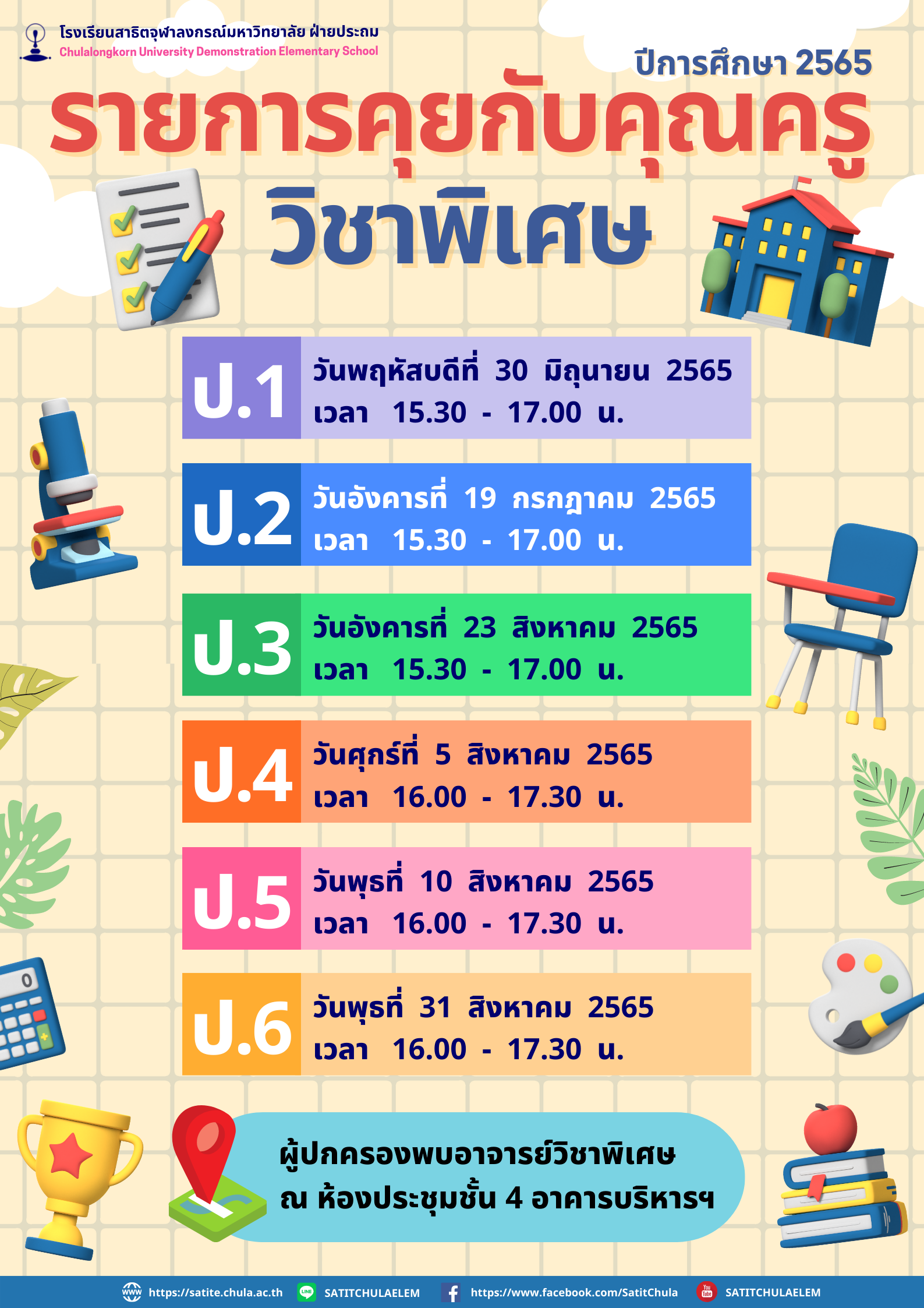 จึงเรียนมาเพื่อโปรดสละเวลามาร่วมกิจกรรมรายการ “คุยกับคุณครู” (วิชาพิเศษ) ตามวัน เวลา และสถานที่ดังกล่าว หากไม่สะดวกในวันและเวลาดังกล่าวสามารถติดต่ออาจารย์ได้ทางช่องสนทนา CUD Smart School ทั้งนี้ทางโรงเรียนขอความกรุณาผู้ปกครองเข้าร่วมประชุม 1 ท่าน : นักเรียน 1 คน โรงเรียนและสมาคมผู้ปกครองและครูโรงเรียนสาธิตจุฬาลงกรณ์มหาวิทยาลัย ขอขอบคุณในความร่วมอันดีของทุกท่านมา ณ โอกาสนี้