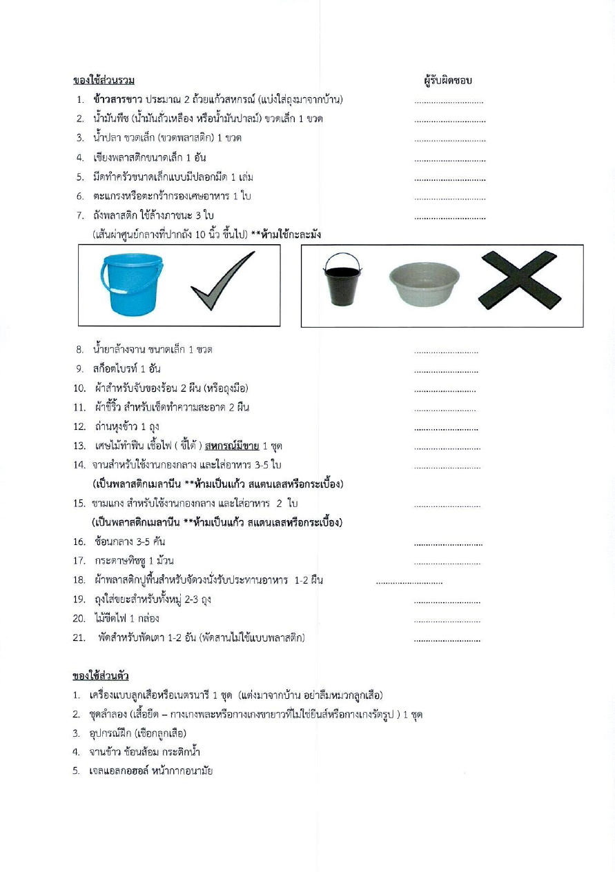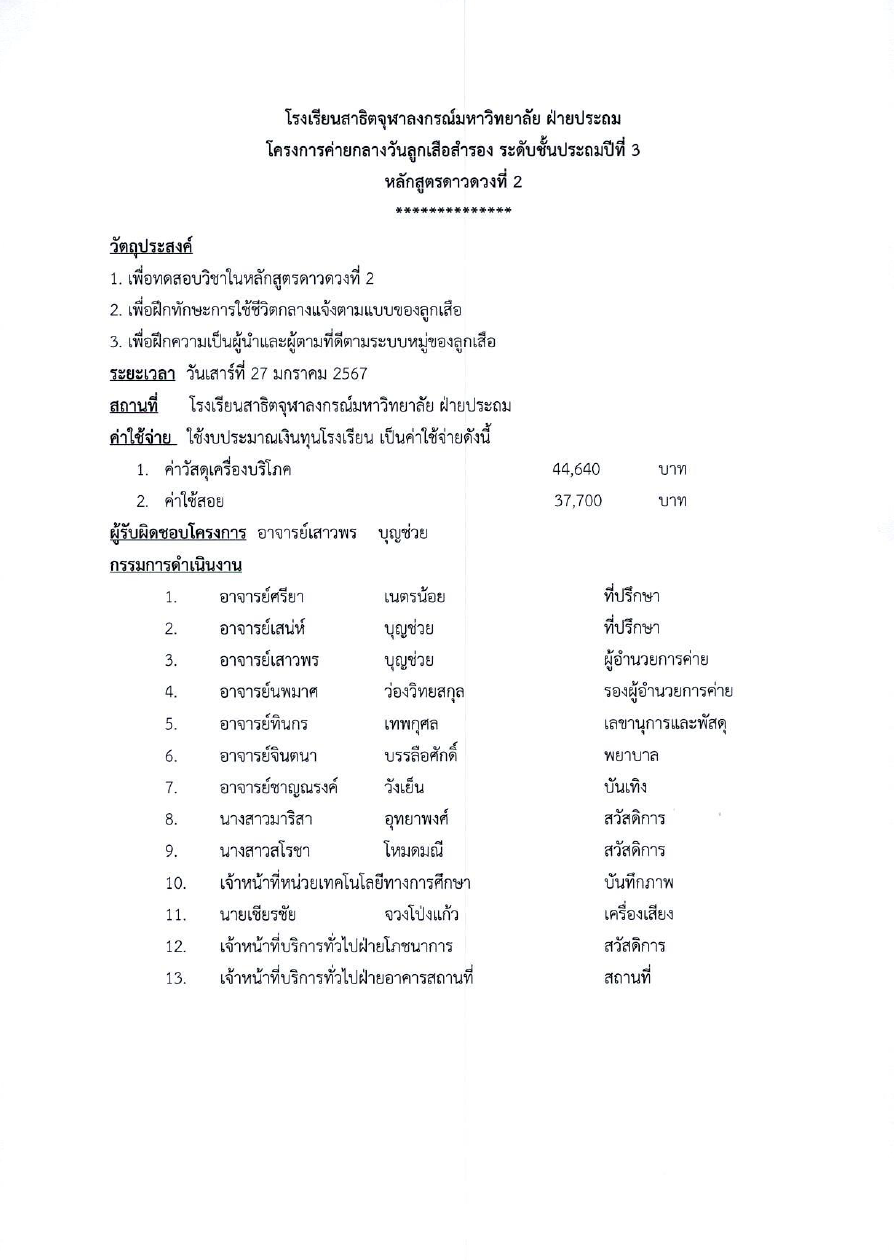 ด้วยกิจกรรมพัฒนาผู้เรียนลูกเสือและเนตรนารีโรงเรียนสาธิตจุฬาลงกรณ์มหาวิทยาลัย ฝ่ายประถม ได้กำหนดให้ลูกเสือสำรอง ระดับชั้นประถมศึกษาปีที่ 3 อยู่ค่ายกลางวันเพื่อทดสอบวิชาในหลักสูตรลูกเสือดาวดวงที่ 2 และวิชาพิเศษลูกเสือสำรอง ในวันเสาร์ที่ 27 มกราคม 2567 ณ ค่ายลูกเสือโรงเรียนสาธิตจุฬาลงกรณ์มหาวิทยาลัย ฝ่ายประถม ดังมีรายละเอียดตามโครงการที่ที่ส่งมาด้วยแล้ว ทั้งนี้โดยมีอาจารย์เสาวพร บุญช่วย เป็นผู้อำนวยการฝึก