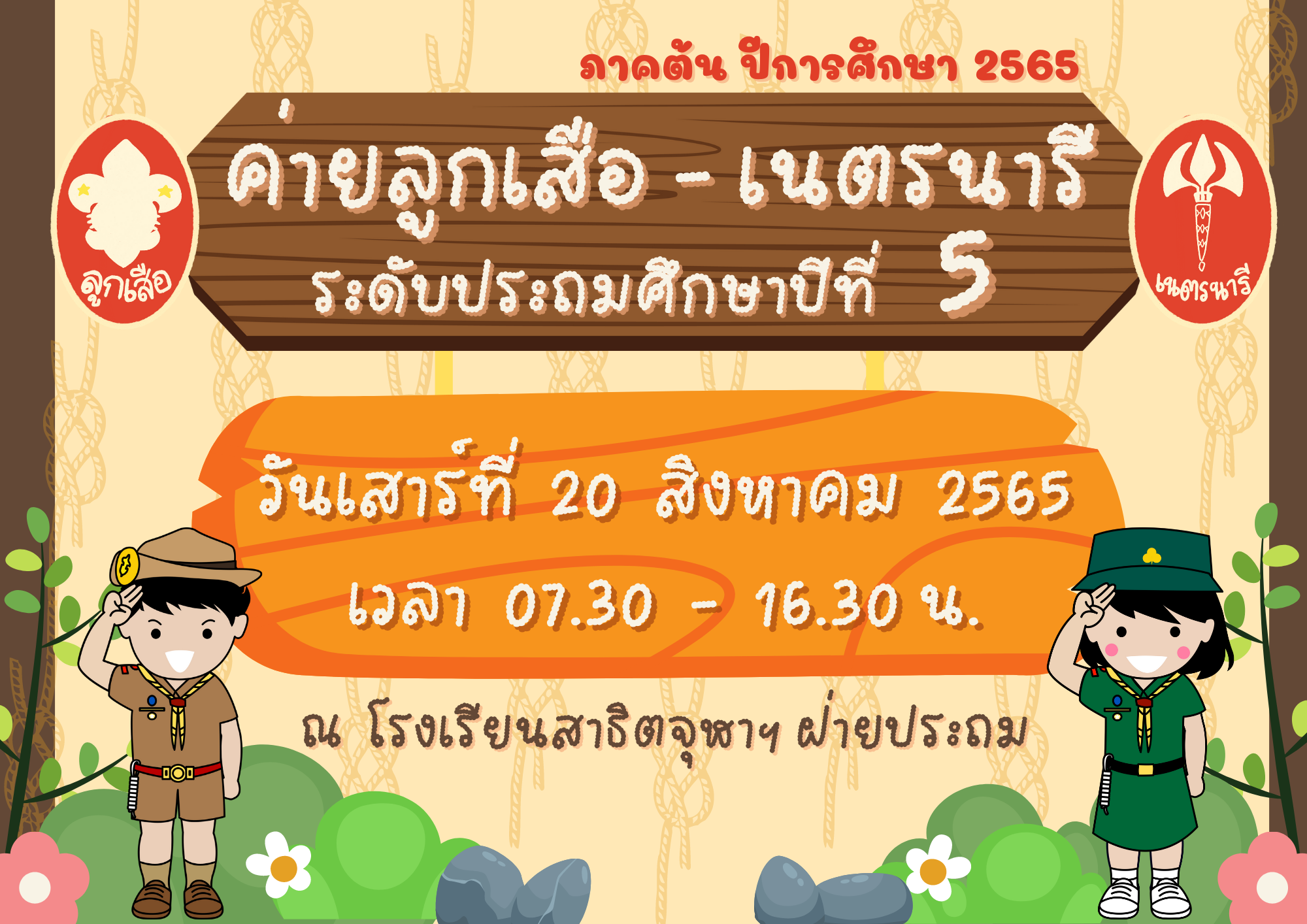 กำหนดจัดค่ายลูกเสือ – เนตรนารี สำหรับนักเรียนระดับชั้นประถมศึกษาปีที่ 5 ภาคต้น ปีการศึกษา 2565 เพื่อทดสอบวิชาในหลักสูตรลูกเสือตรีและปฏิญาณตนเข้าประจำกอง ในวันเสาร์ที่ 20 สิงหาคม 2565 ระหว่างเวลา 07.30 – 16.30 น. ณ โรงเรียนสาธิตจุฬาลงกรณ์มหาวิทยาลัย ฝ่ายประถม