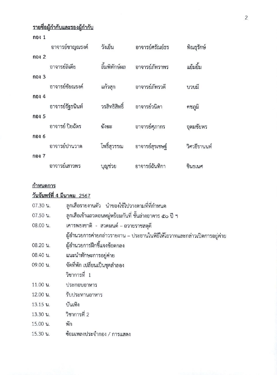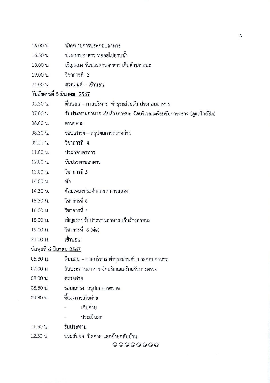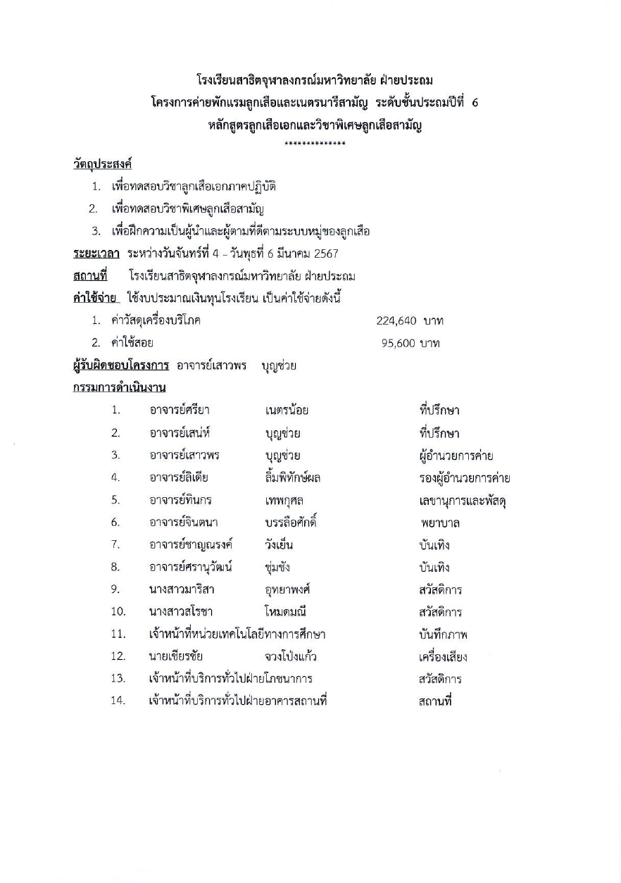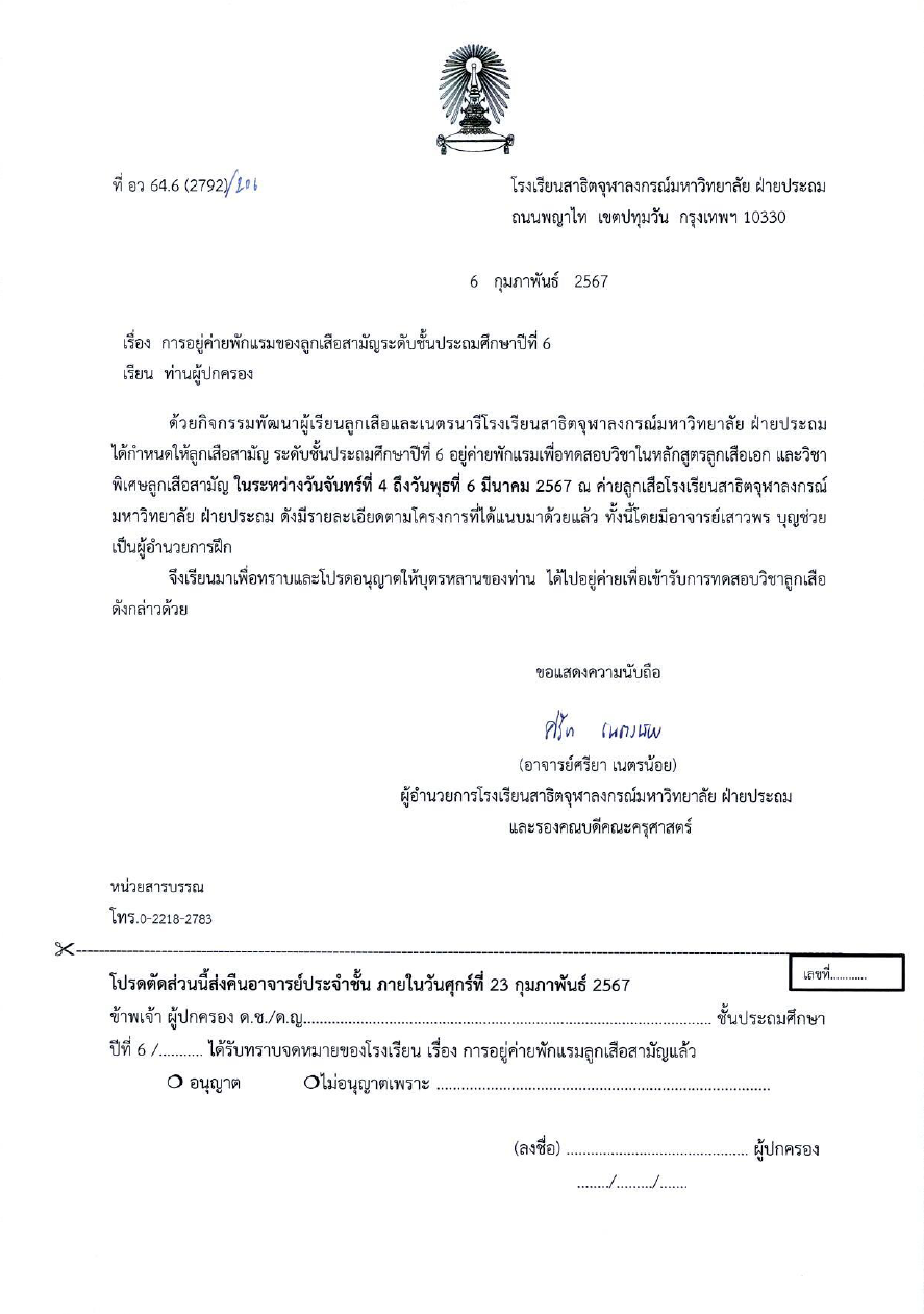 ด้วยกิจกรรมพัฒนาผู้เรียนลูกเสือและเนตรนารีโรงเรียนสาธิตจุฬาลงกรณ์มหาวิทยาลัย ฝ่ายประถม ได้กำหนดให้ลูกเสือสามัญ ระดับชั้นประถมศึกษาปีที่ 6 อยู่ค่ายพักแรมเพื่อทดสอบวิชาในหลักสูตรลูกเสือเอก และวิชาพิเศษลูกเสือสามัญ ในระหว่างวันจันทร์ที่ 4 มีนาคม 2567 ถึงวันพุธที่ 6 มีนาคม 2567 ณ ค่ายลูกเสือโรงเรียนสาธิตจุฬาลงกรณ์มหาวิทยาลัย ฝ่ายประถม ดังมีรายละเอียดจดหมายโรงเรียน