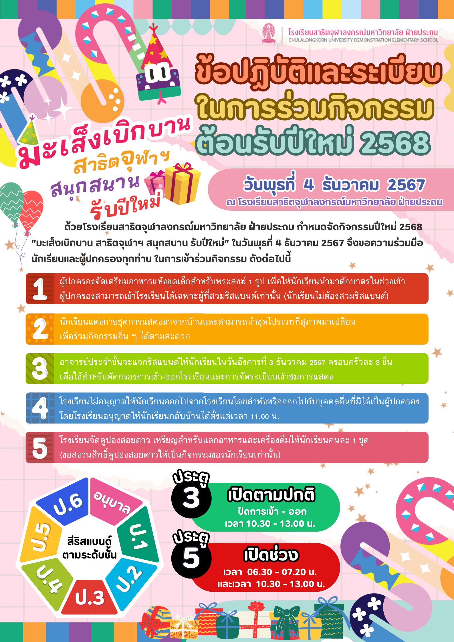 เพื่อความปลอดภัยของบุตรหลาน โปรดกำชับให้นักเรียนเก็บรักษากระเป๋าสตางค์และของมีค่าให้มิดชิด ไม่นำของเล่นหรือของมีค่าติดตัวมาโรงเรียน ขอให้นักเรียนนำถุงผ้ามาเพื่อใส่ของรางวัลที่เล่นเกม ทางโรงเรียนจะไม่แจกถุงพลาสติกให้ รวมถึงขอให้นักเรียนทุกคนต้องพกบัตรประจำตัวนักเรียนมาด้วย ผู้ปกครองโปรดคล้องบัตรประจำตัวตลอดเวลาที่อยู่ภายในบริเวณโรงเรียน กิจกรรม “มะเส็งเบิกบาน สาธิตจุฬาฯ สนุกสนาน รับปีใหม่” จะเสร็จสิ้นเวลา 14.30 น. จึงขอความร่วมมือผู้ปกครองมารับบุตรหลานด้วยตัวเอง เนื่องด้วยทางโรงเรียนไม่อนุญาตให้นักเรียนนัดหมายกันหรือออกไปจากโรงเรียนโดยลำพังหรือออกไปกับบุคคลอื่นที่มิได้เป็นผู้ปกครองที่มีข้อมูลอยู่ในระบบฐานข้อมูลของโรงเรียน โรงเรียนอนุญาตให้นักเรียนกลับบ้านได้ตั้งแต่เวลา 11.00 น. เป็นต้นไป