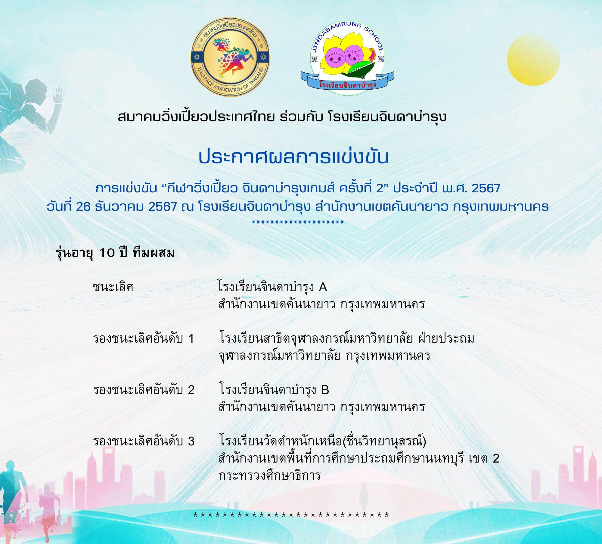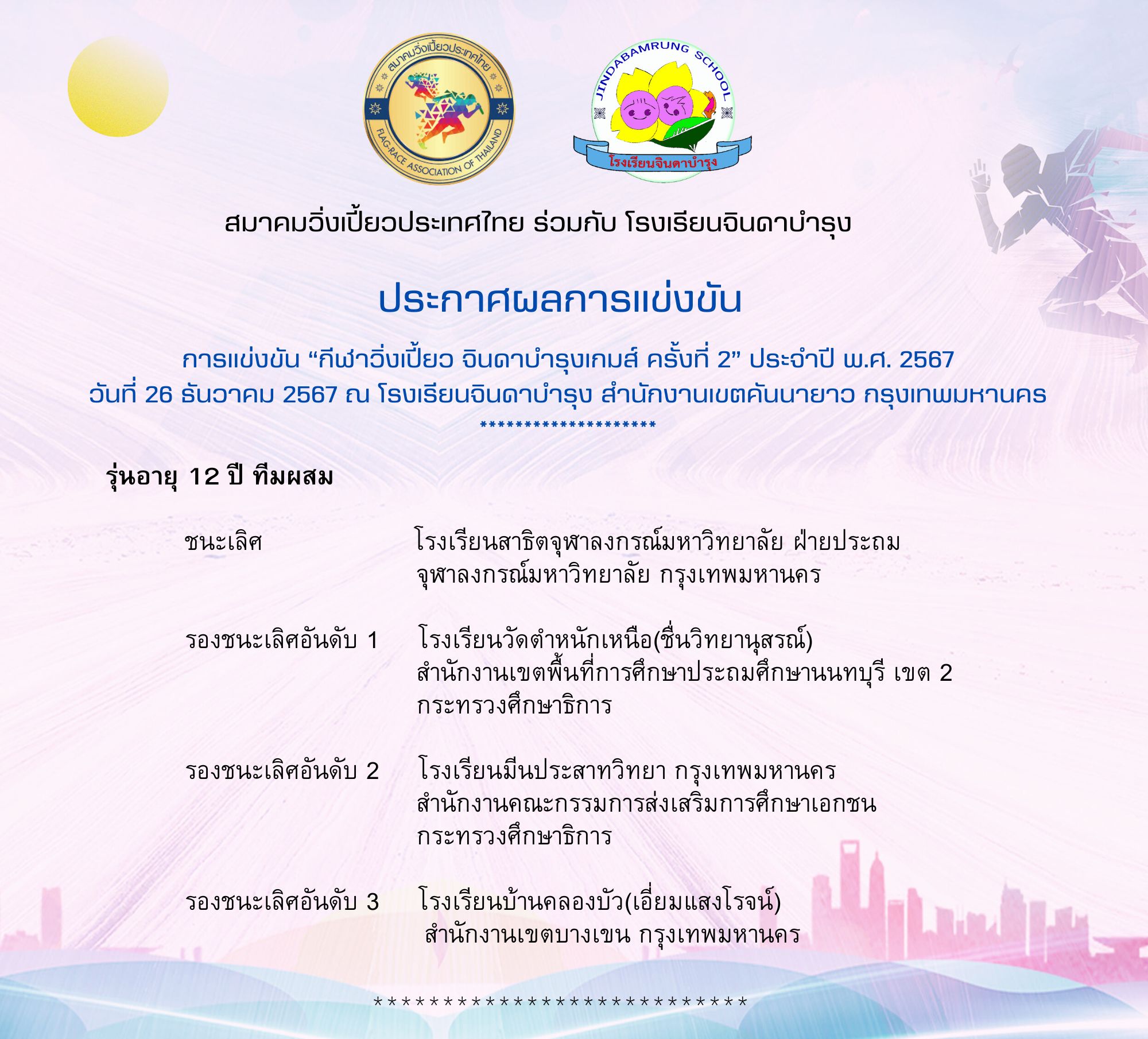 กลุ่มสาระการเรียนรู้สุขศึกษาและพลศึกษา นำทีมกีฬากรีฑาของโรงเรียน เข้าร่วมการแข่งขันวิ่งเปี้ยว ในนามโรงเรียนสาธิตจุฬาลงกรณ์มหาวิทยาลัย ฝ่ายประถม รายการ จินดาบำรุงเกมส์ ครั้งที่ 2 ประจำปี 2567 ณ สนามกีฬาโรงเรียนจินดาบำรุง เขตคันนายาว กรุงเทพมหานคร เมื่อวันพฤหัสบดีที่ 26 ธันวาคม 2567 ที่ผ่านมา โดยมีผลการแข่งขันรางวัล ดังนี้
