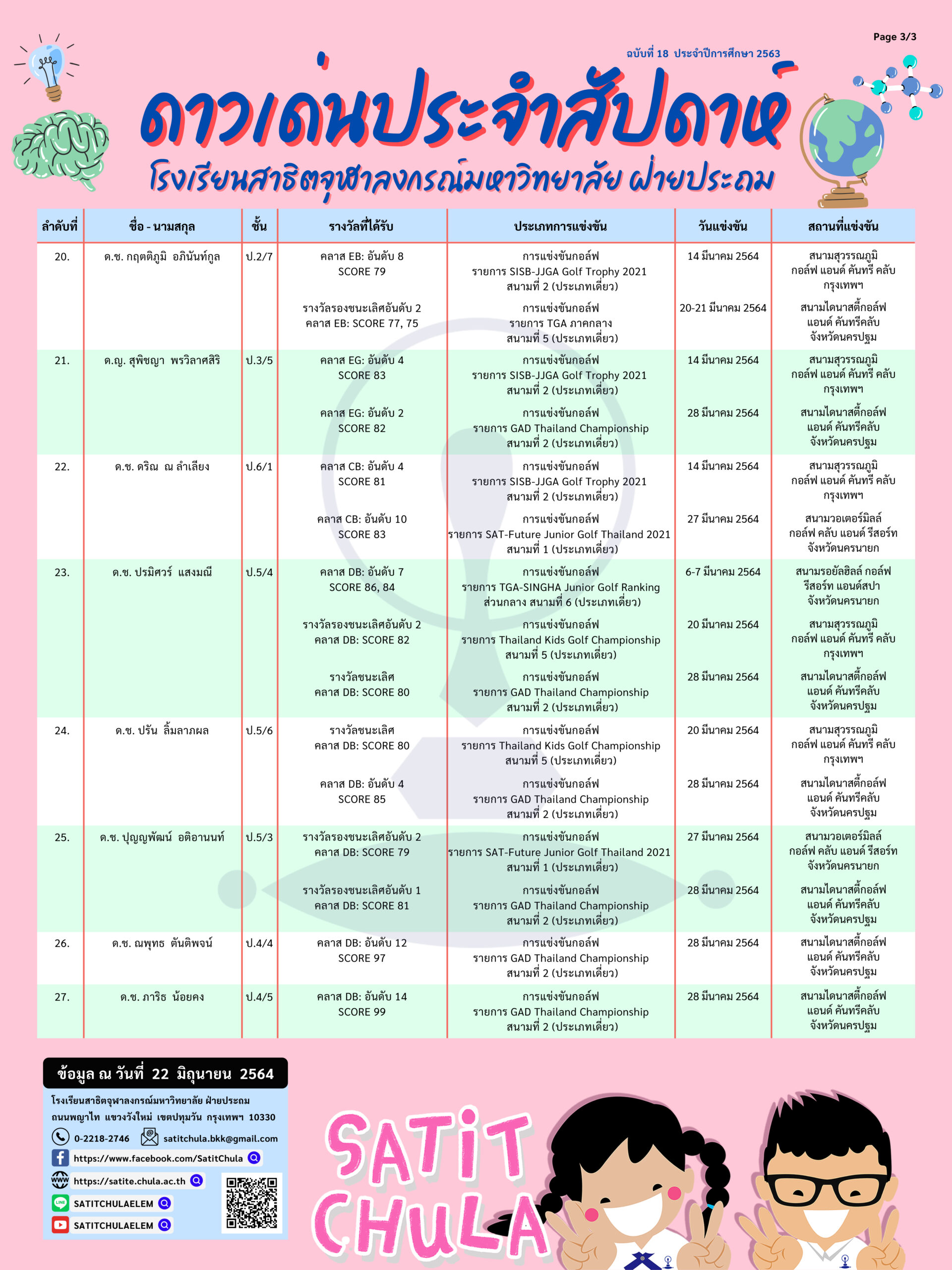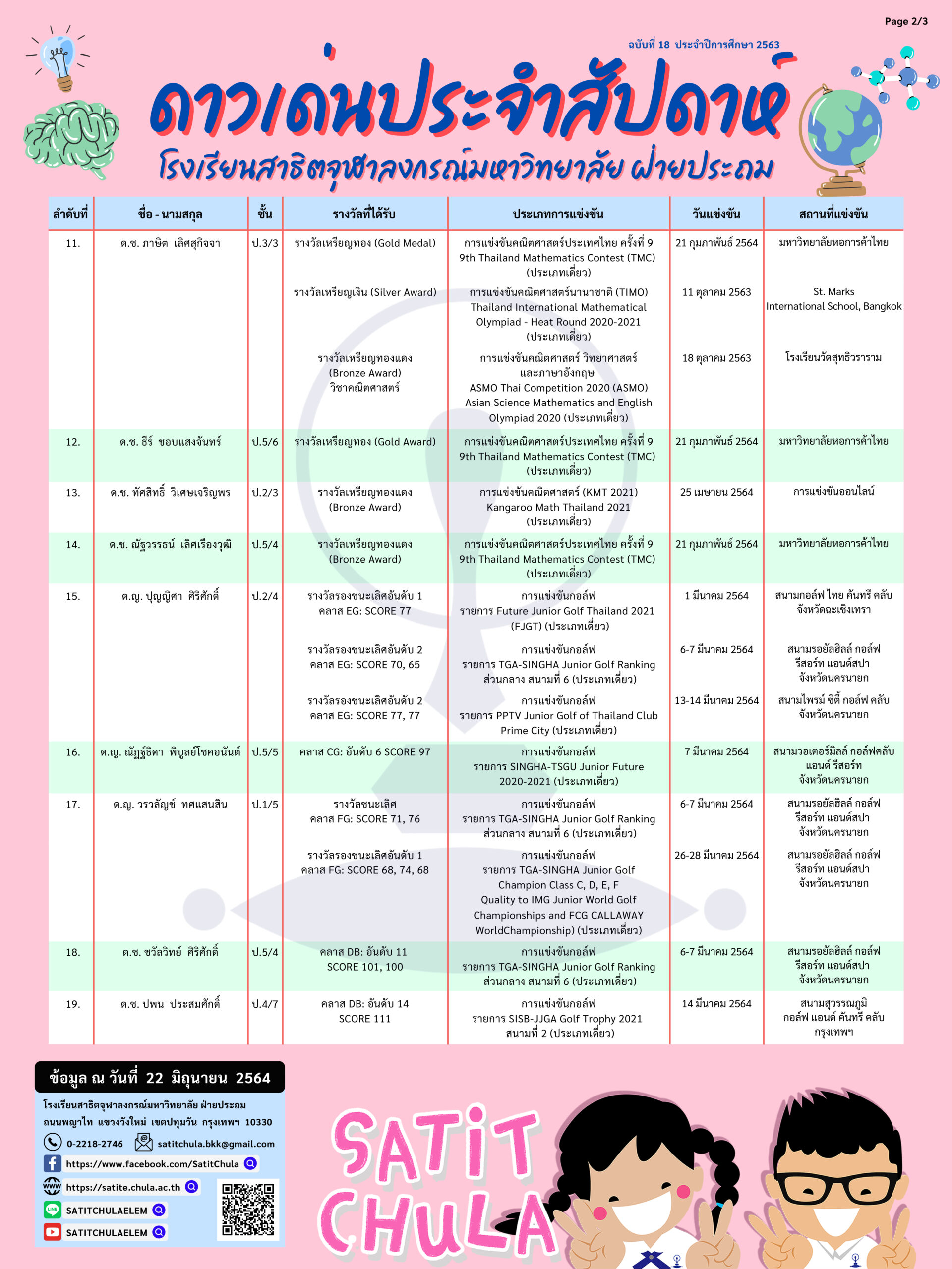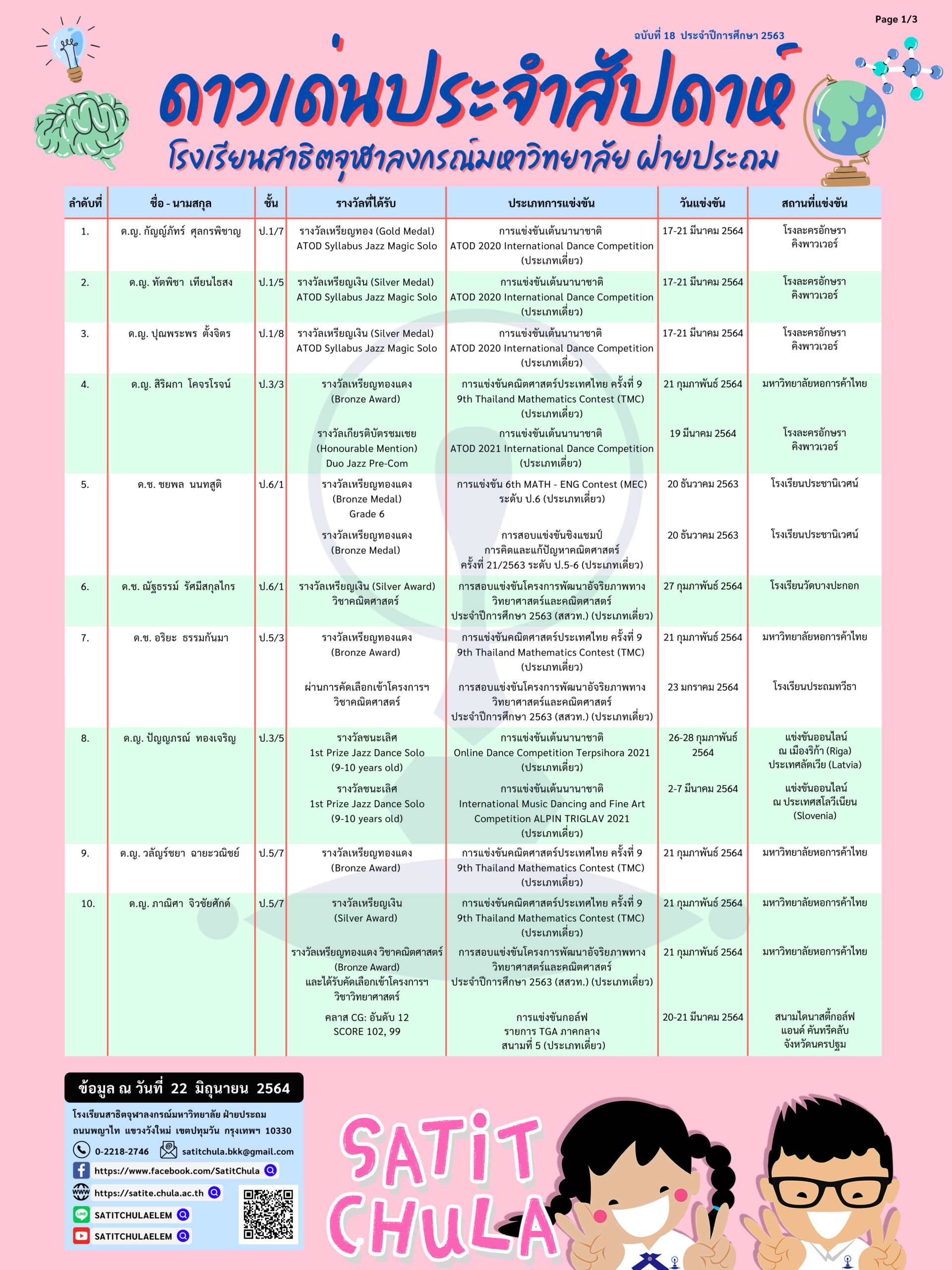 ดาวเด่นประจำสัปดาห์ ประจำปีการศึกษา 2563 – ฉบับที่ 18 (ข้อมูล ณ วันที่ 22 มิถุนายน 2564) By Web Master|2021-06-22T04:50:42+07:00June 22, 2021|ความภูมิใจสาธิตจุฬาฯ| View Larger Image ดาวน์โหลดเอกสาร PDF File คลิกที่นี่ ดาวน์โหลดรูปภาพ ขนาด HD คลิกที่นี่