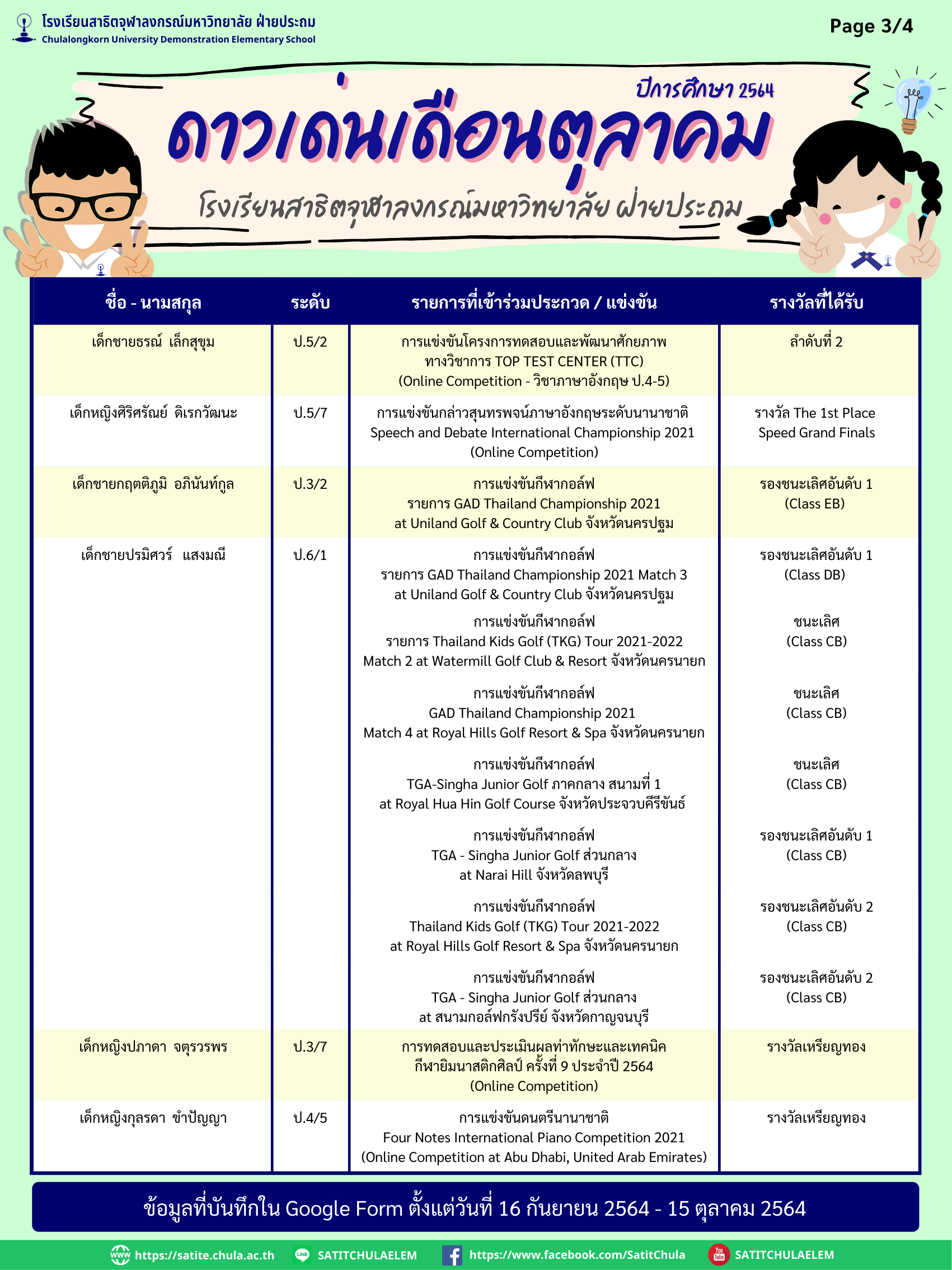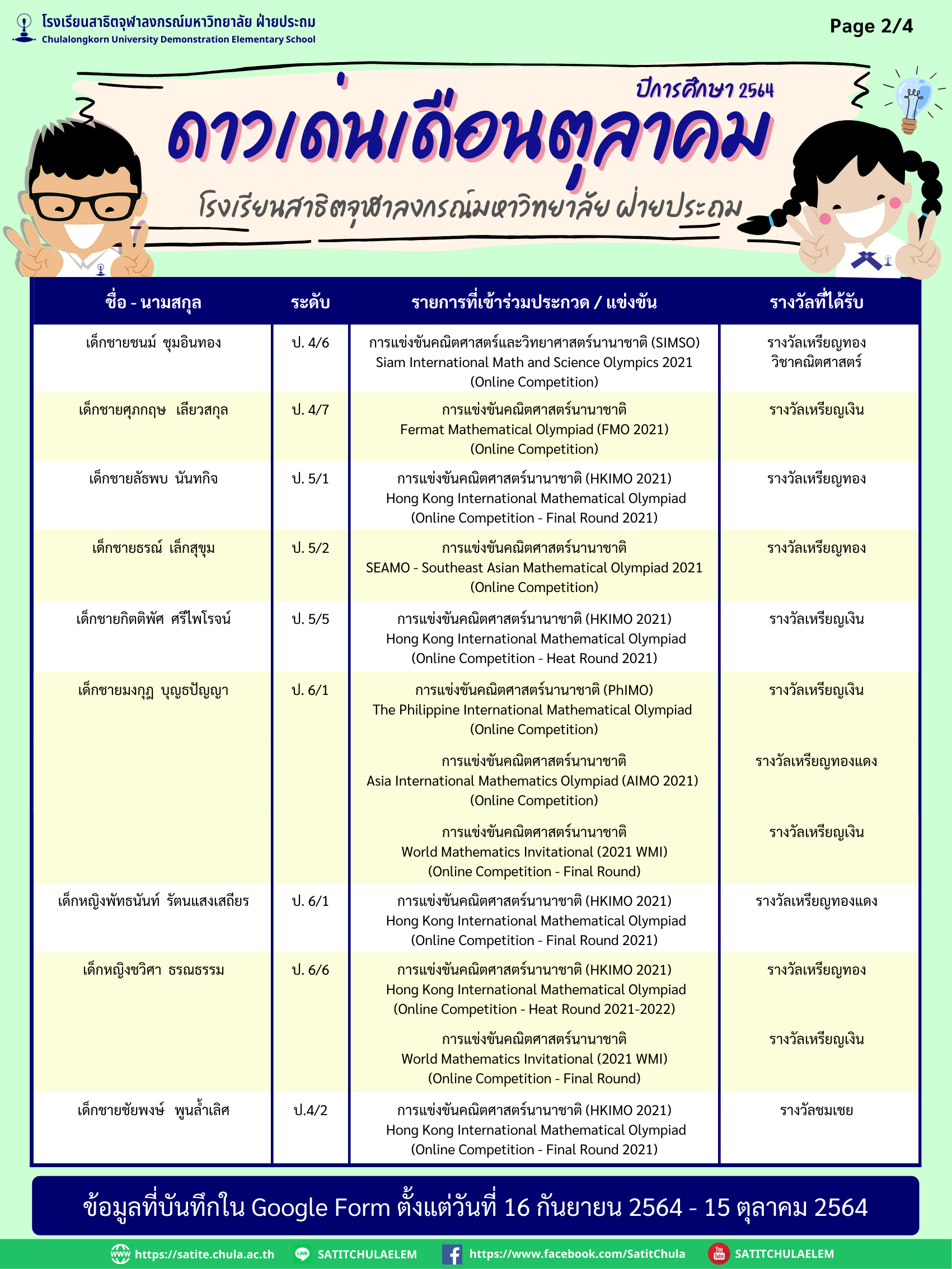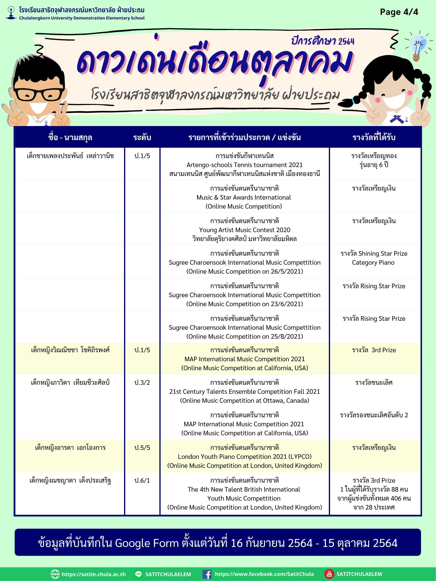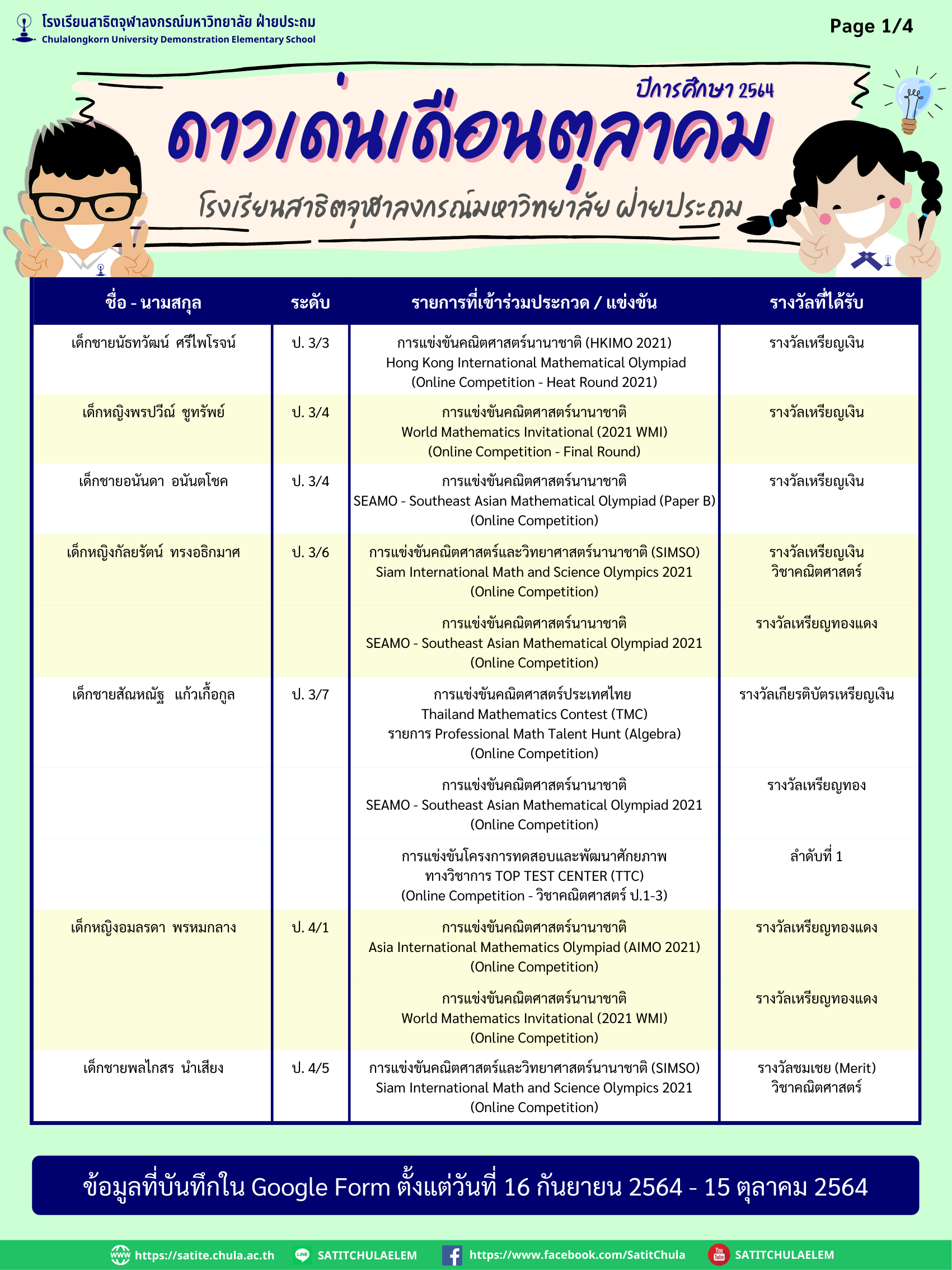 ดาวเด่นเดือนตุลาคม ประจำปีการศึกษา 2564 (ข้อมูลบันทึกใน Google Form ตั้งแต่วันที่ 16 กันยายน – 15 ตุลาคม 2564) By Web Master|2021-10-28T12:55:22+07:00October 28, 2021|ความภูมิใจสาธิตจุฬาฯ| View Larger Image ดาวน์โหลดเอกสาร PDF File คลิกที่นี่