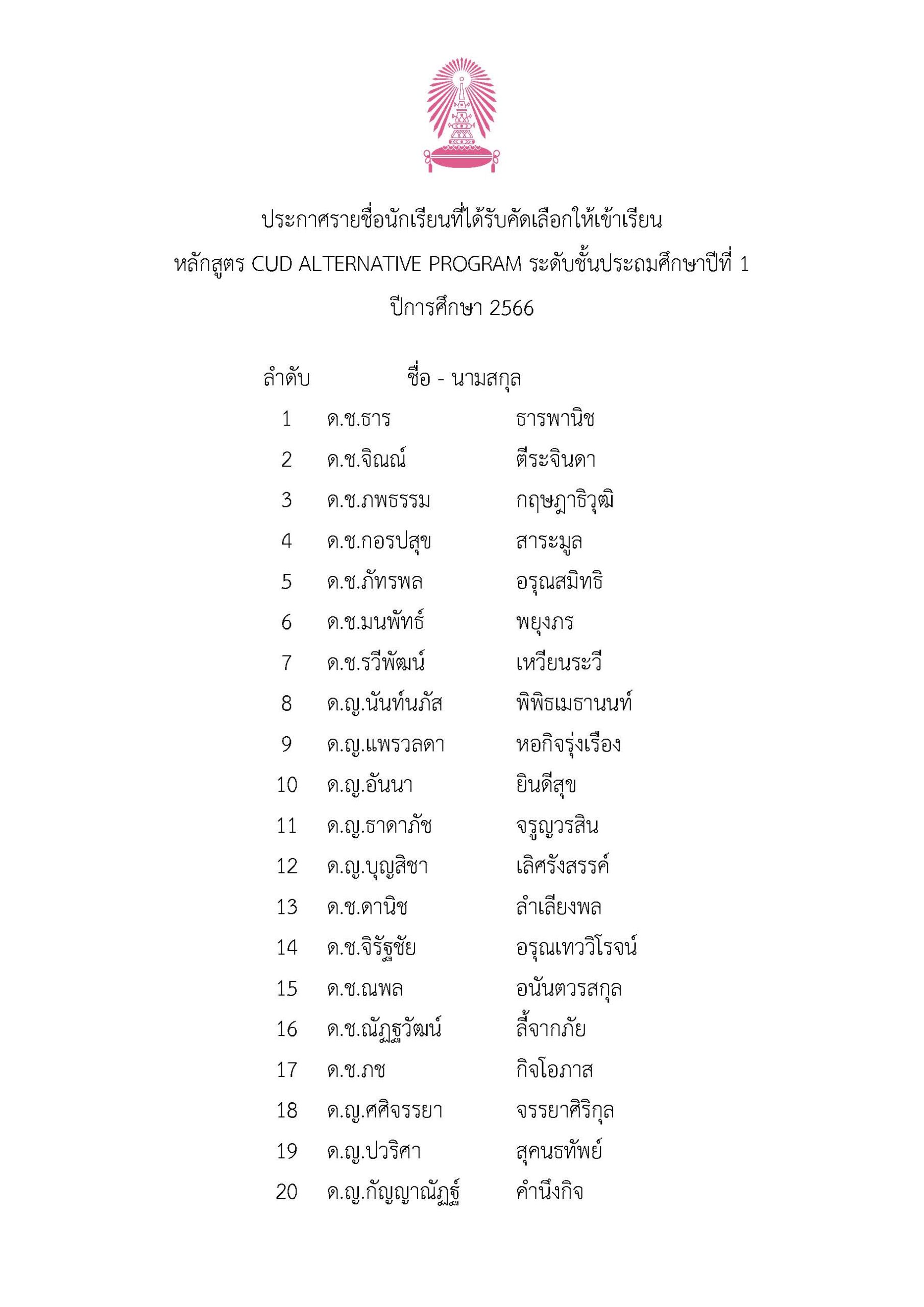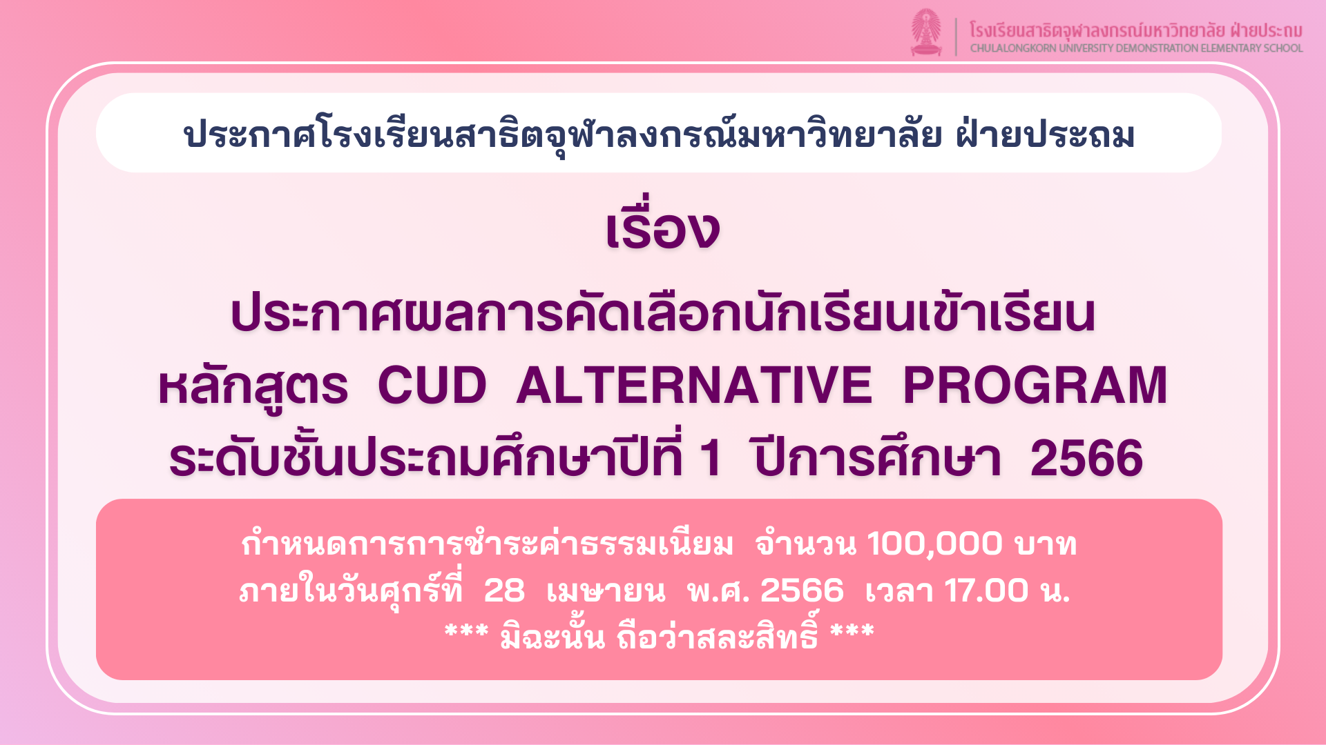 ประกาศผลการคัดเลือกนักเรียนเข้าเรียนหลักสูตร CUD ALTERNATIVE PROGRAM ระดับชั้นประถมศึกษาปีที่ 1 ปีการศึกษา 2566 โรงเรียนสาธิตจุฬาลงกรณ์มหาวิทยาลัย ฝ่ายประถม