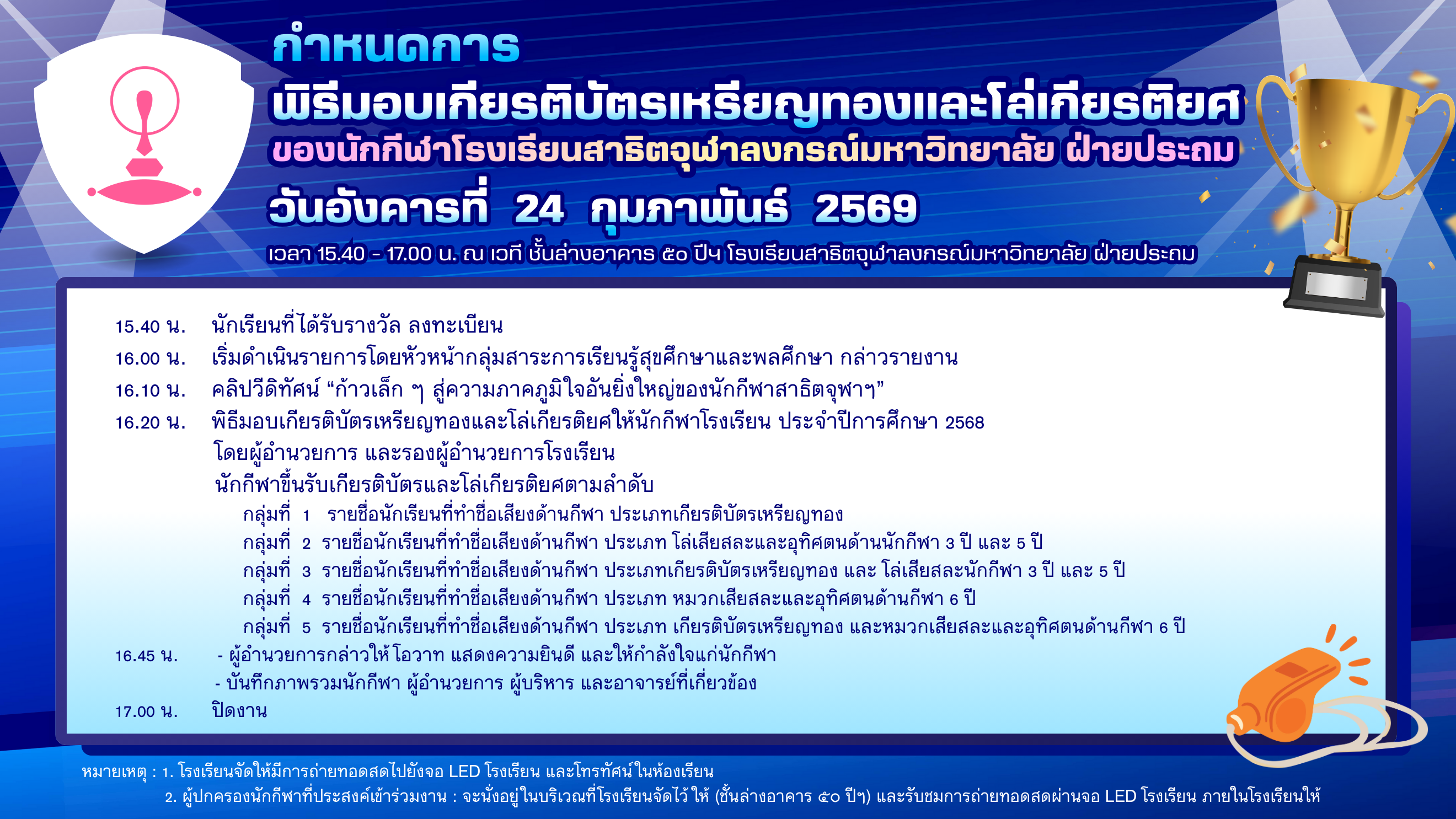 2. ผู้ปกครองนักกีฬาที่ประสงค์เข้าร่วมงาน : จะนั่งอยู่ในบริเวณที่โรงเรียนจัดไว้ให้ (ชั้นล่างอาคาร ๕๐ ปีฯ) และรับชมการถ่ายทอดสดผ่านจอ LED โรงเรียน ภายในโรงเรียนให้